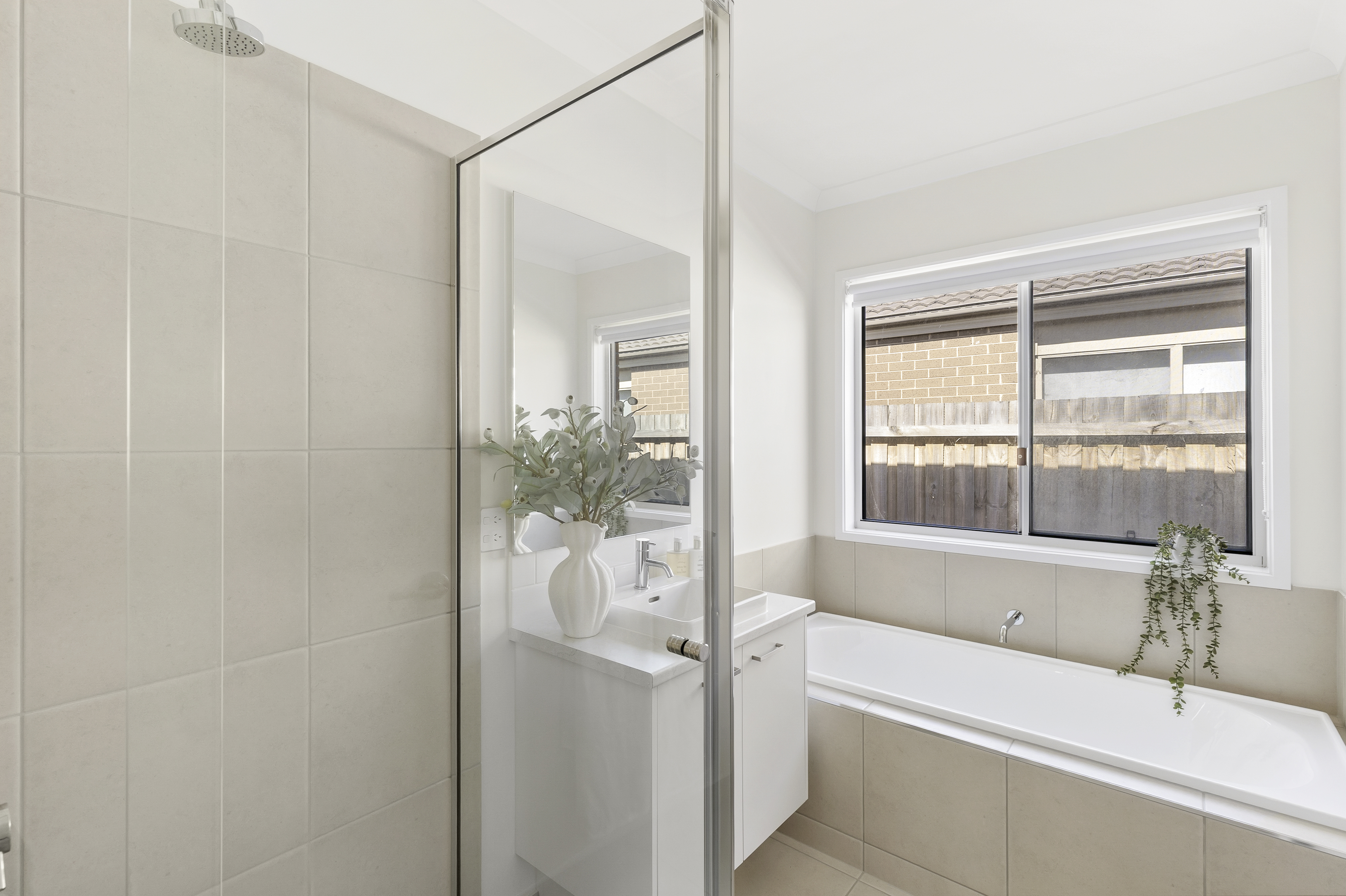 Main Bathroom: Bath, single vanity with ample storage, semi-frameless shower, power points, towel rack, window and separate toilet.