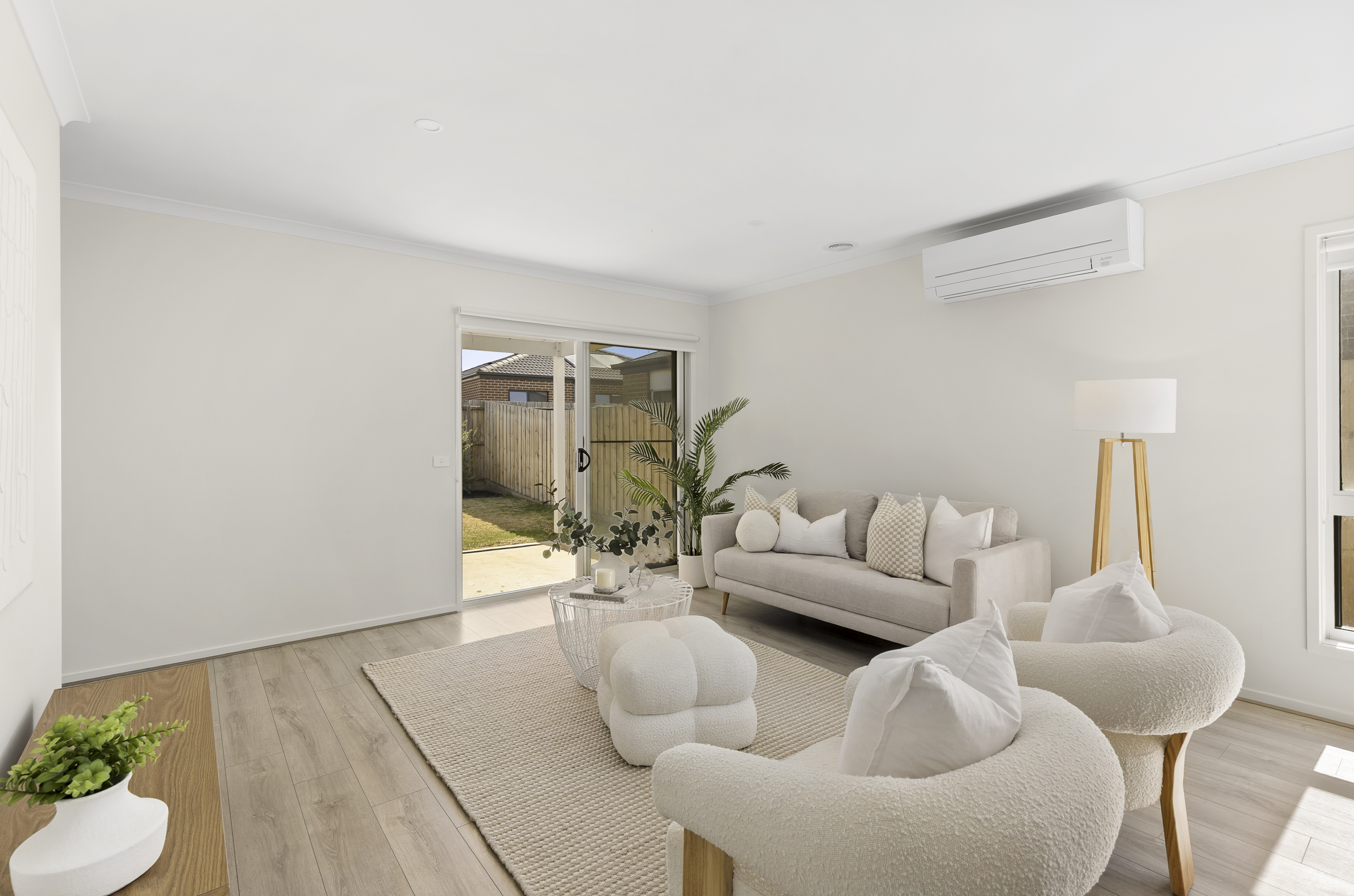 Living/Dining: Double glazed windows in main living and sliding door, practical and light-filled open-plan living and dining, with effortless flow into the outdoor entertaining area via sliding doors. Hybrid flooring, windows, ducted heating, split system cooling, roller blinds, TV and power points, downlights.