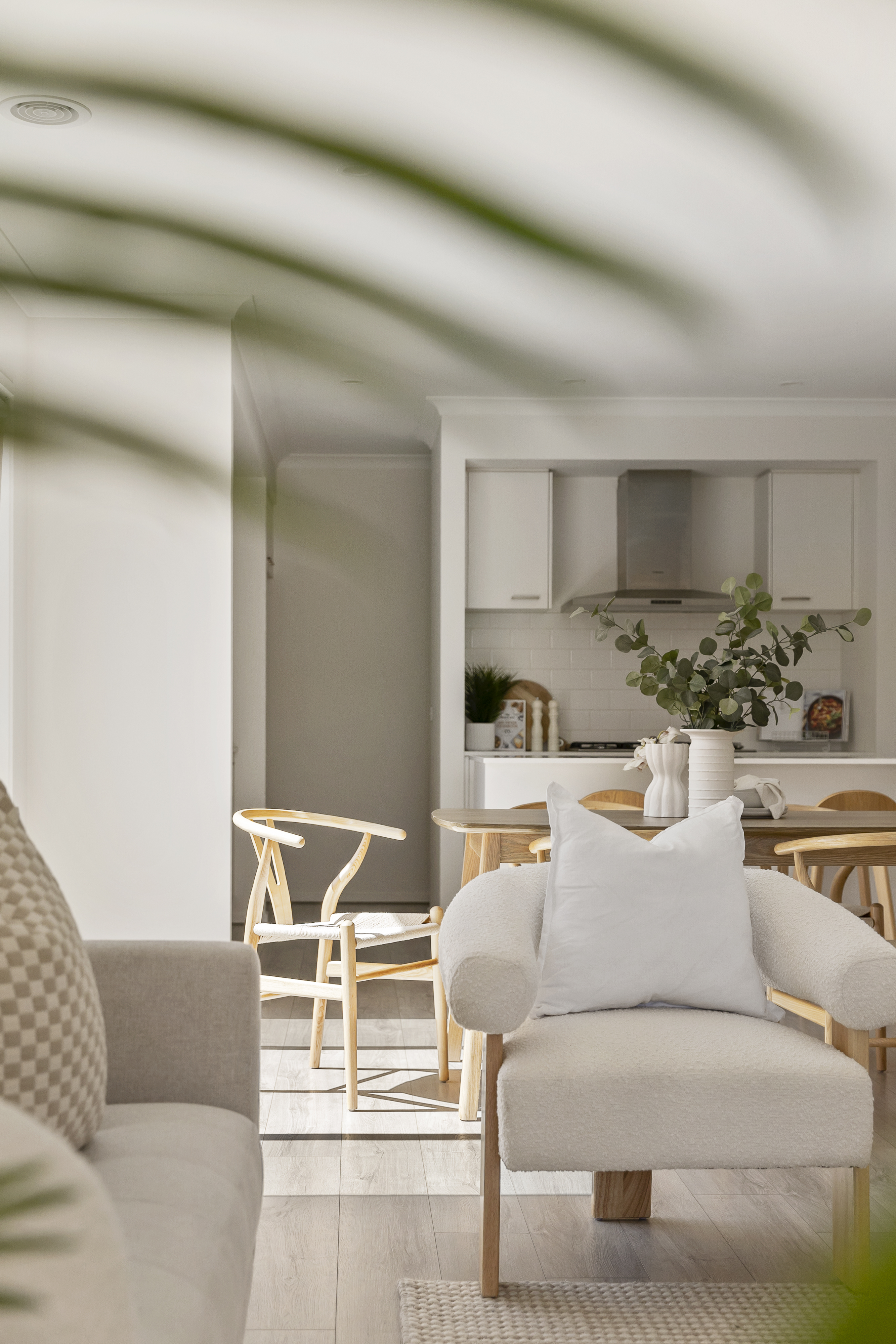 Kitchen: Open-plan kitchen flowing onto living and dining. Features include 20mm stone benchtops, large island bench with breakfast bar overhang, 900mm stainless steel appliances, walk in pantry, overhead cabinetry, fridge cavity, hybrid flooring, tile splashback, pantry, double sink, dishwasher, and downlights.