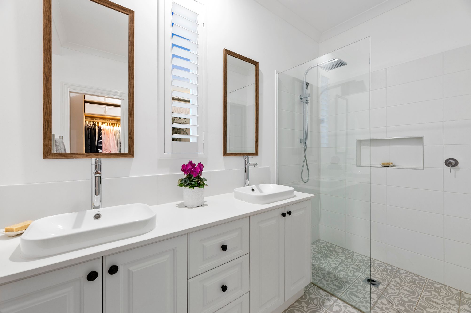 Ensuite: Semi-inset dual basins, twin vanity with shaker-style cabinetry, stone benchtop, custom mirrors with wooden framing, heritage tiling, extended shower containing waterfall shower head & hand-held shower head, shower niche, feature heated towel rail, brass fittings, plantation shutters, separate toilet, additional heating vent & tastic lighting