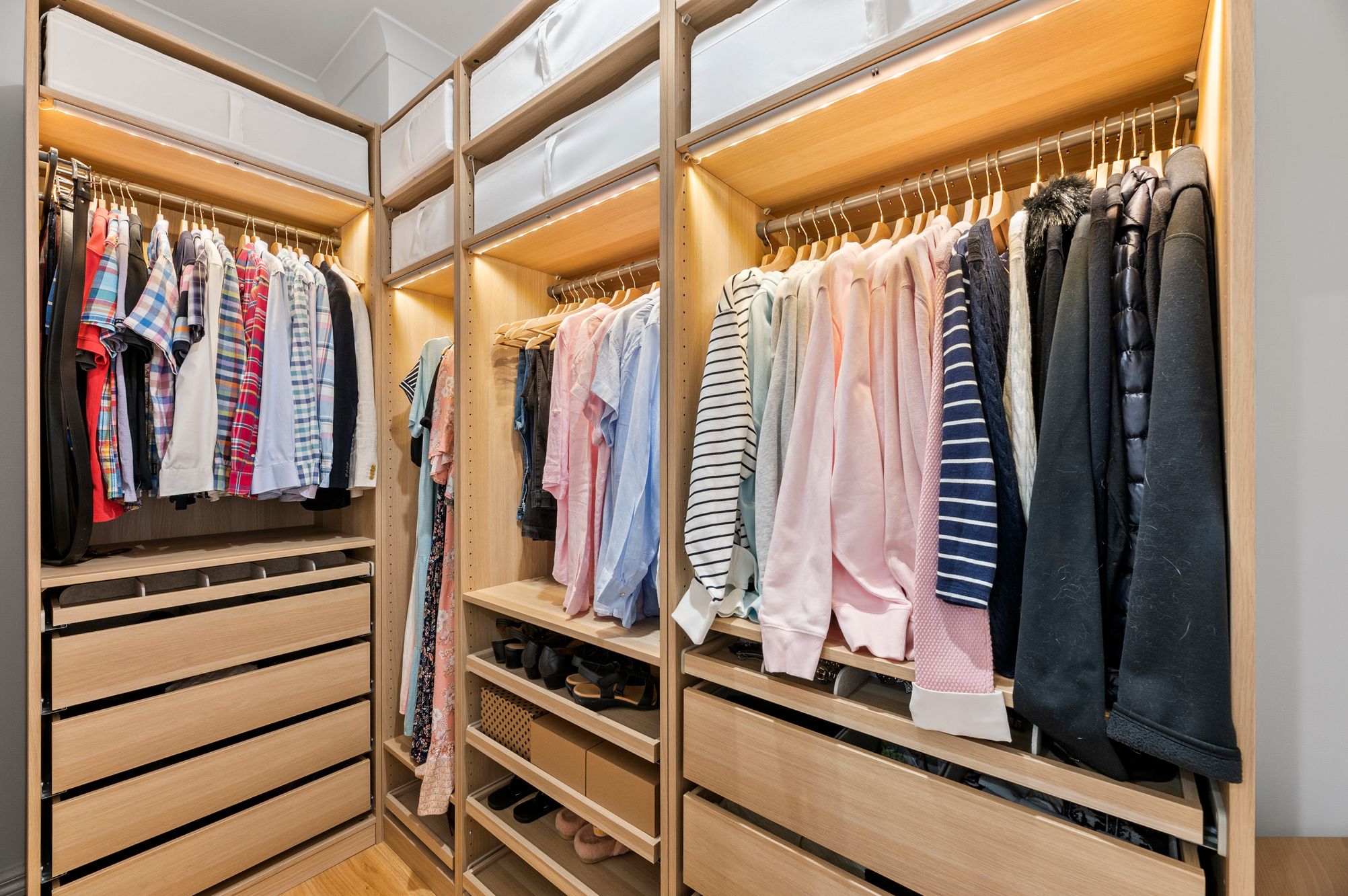Master bedroom: Ducted heating & evaporative cooling, downlights, plantation shutters, luxe walk in robe with built-in shelving and LED strip lighting, high ceilings, Blackbutt floating wood flooring, double glazing
