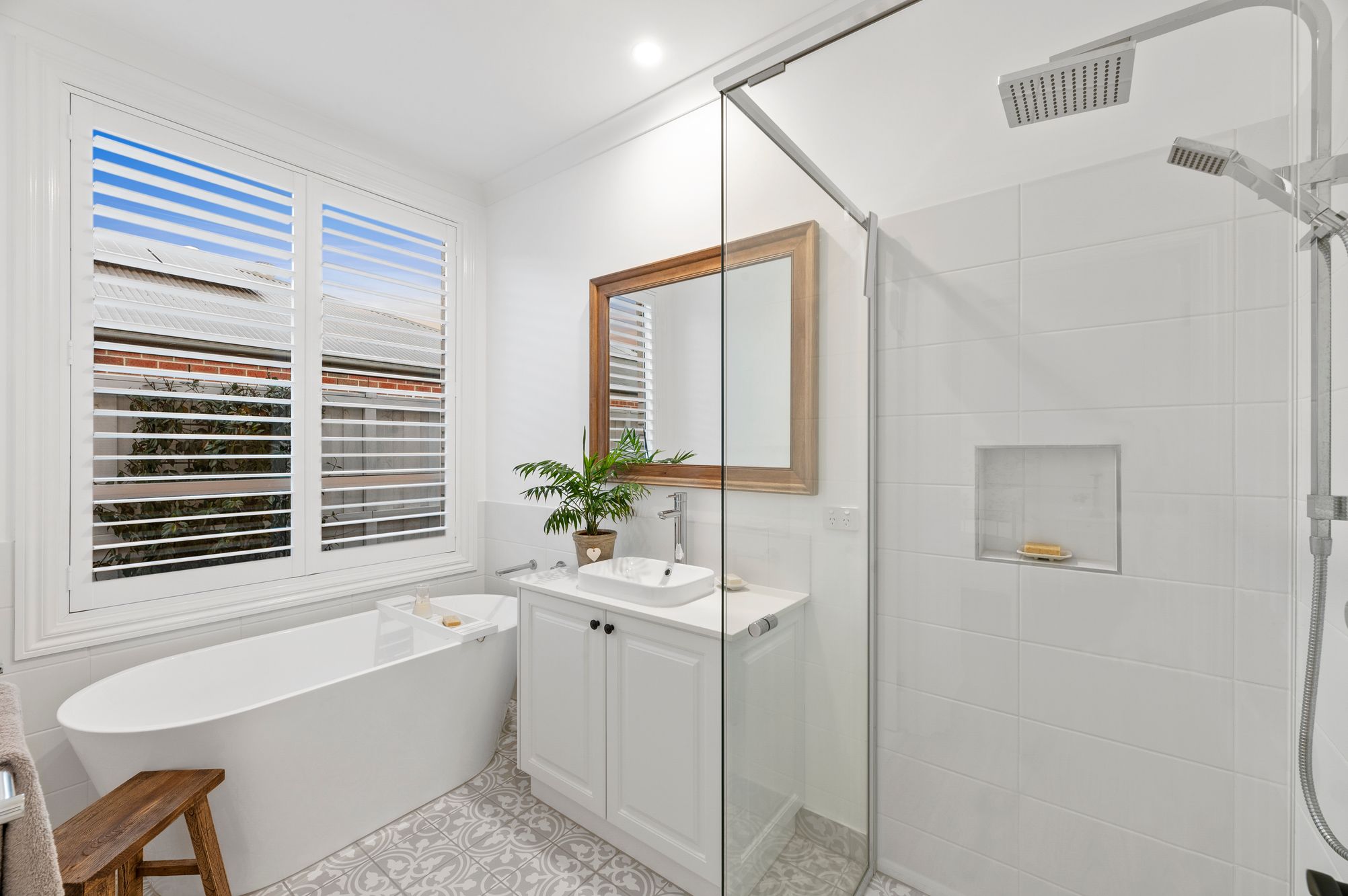 Main bathroom: Freestanding bath, single vanity with shaker-style cabinetry, stone benchtop, large custom mirror with wooden framing, heritage tiling, semi-frameless shower with waterfall shower head & hand-held shower head, niche, feature towel rail, brass fittings, additional heating vent & tastic lighting, separate toilet