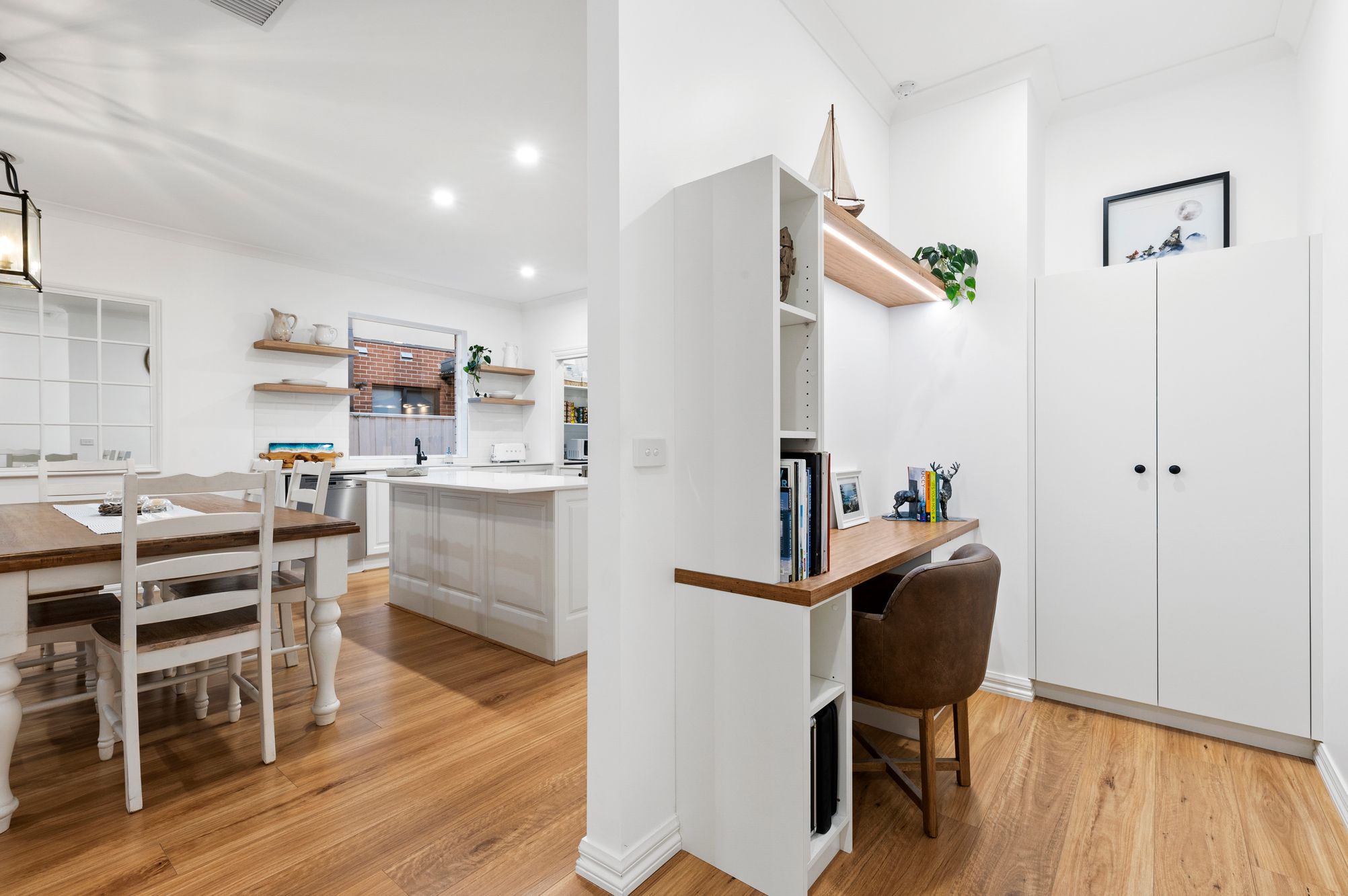 Study nook: Blackbutt wood bench, LED strip lighting, built in cabinetry and filing