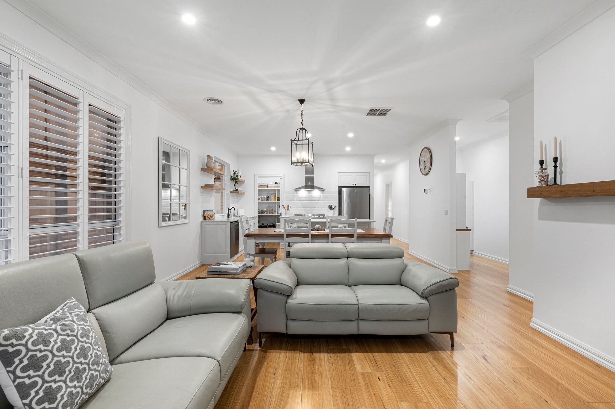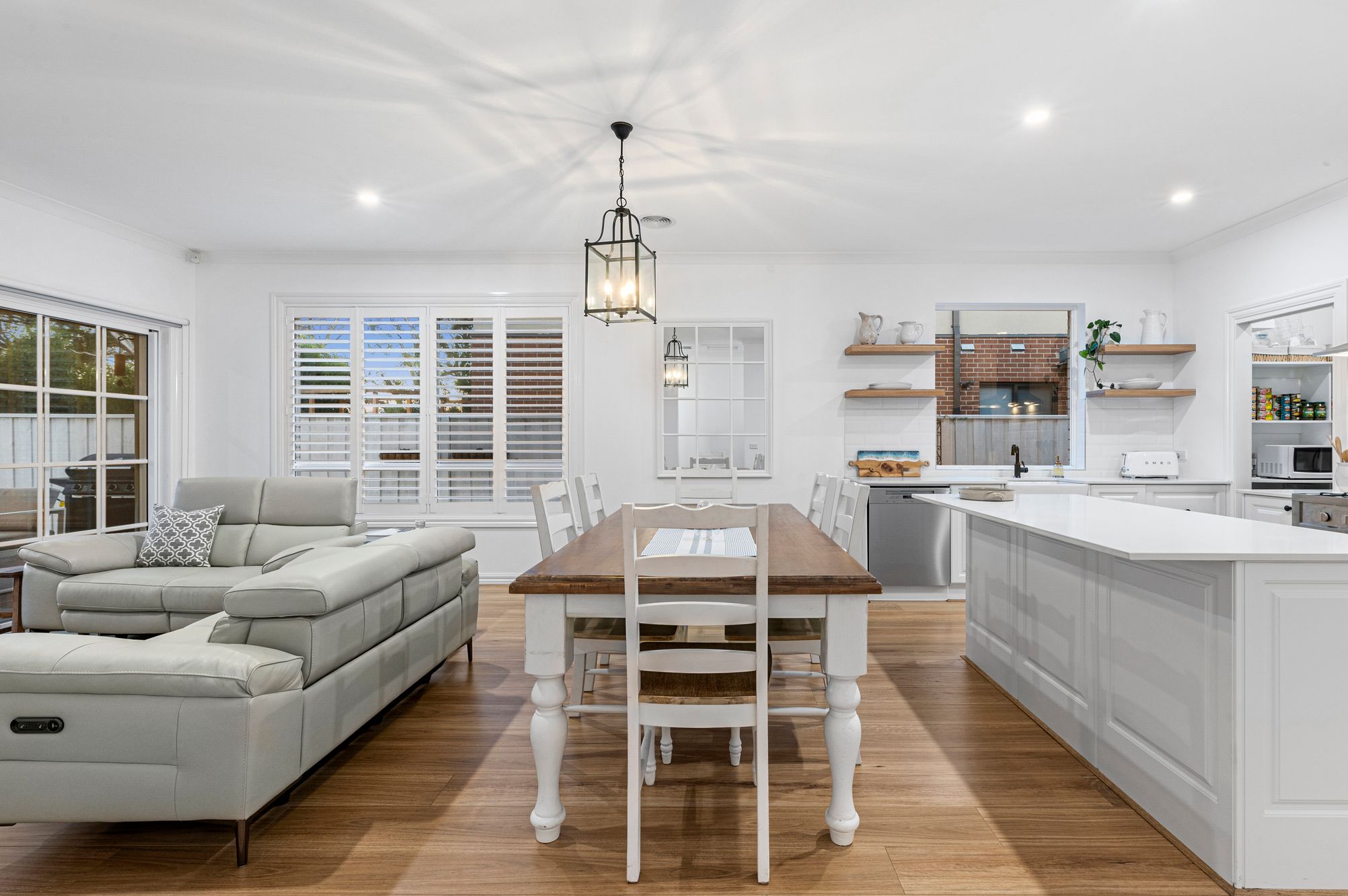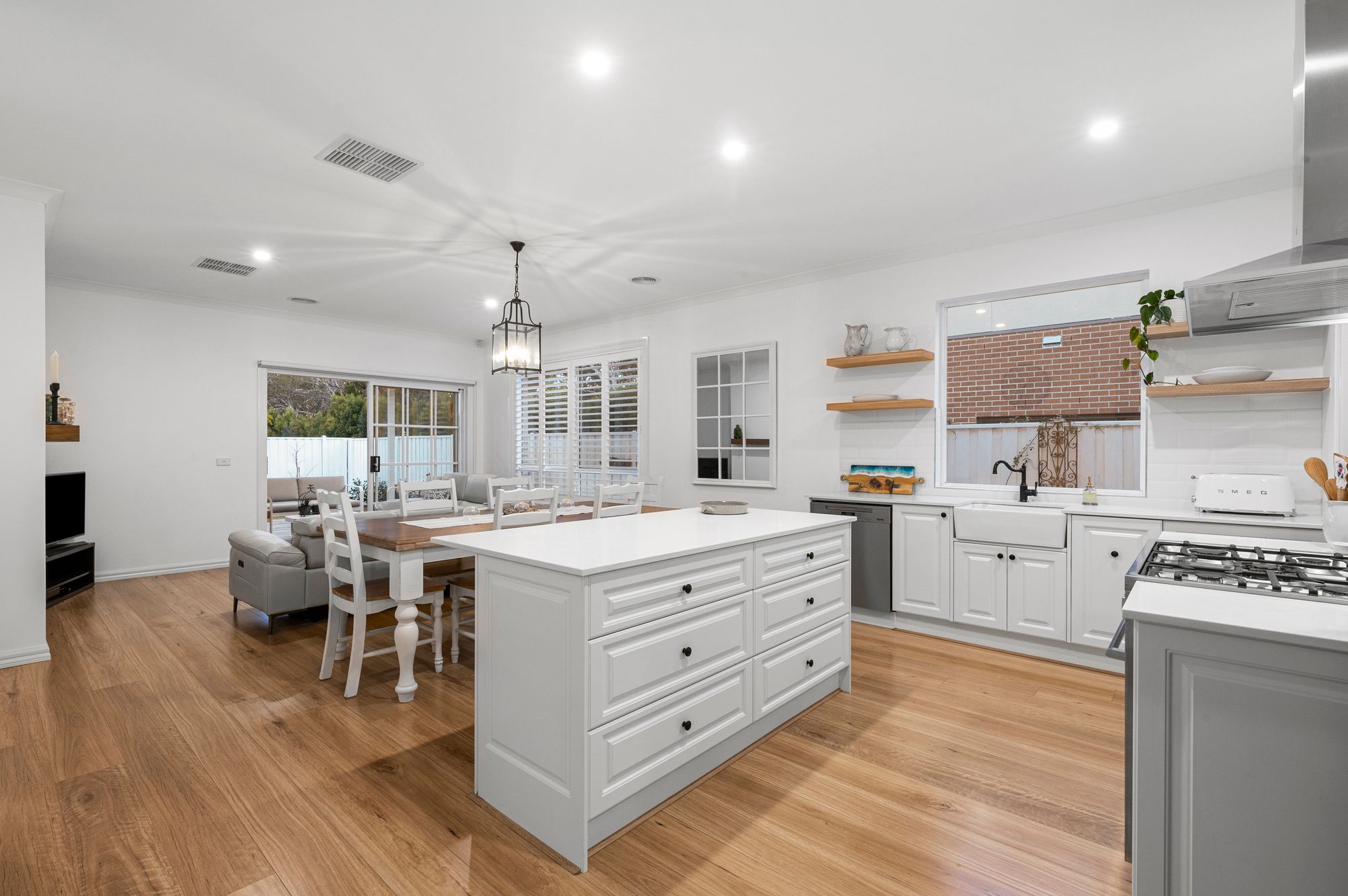 Living/Dining: Open plan, high ceilings, ducted heating & evaporative cooling, downlights throughout, solid brass pendant lighting over dining, Blackbutt floating wood flooring, plantation shutters, provision installed for gas log fire to be added, sliding glass French-style doors open to outdoor alfresco creating indoor/outdoor flow