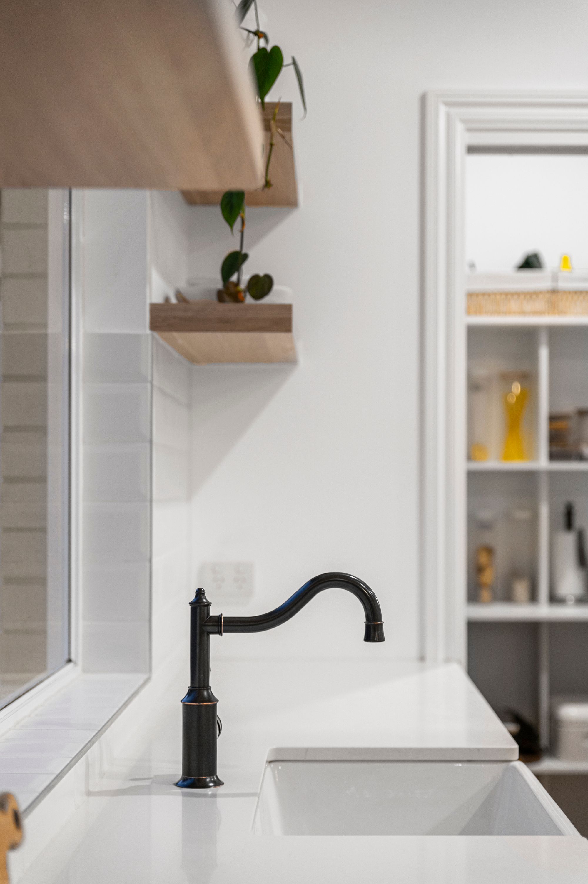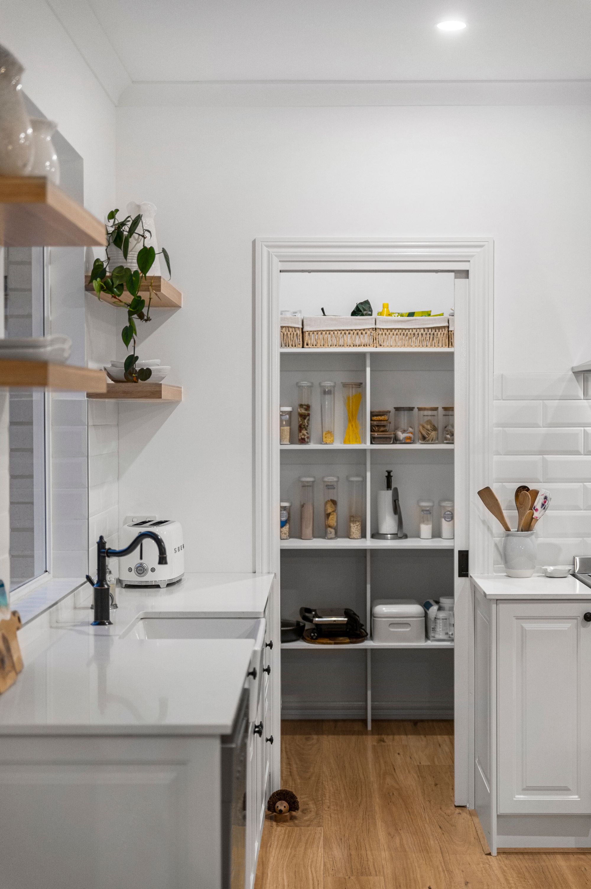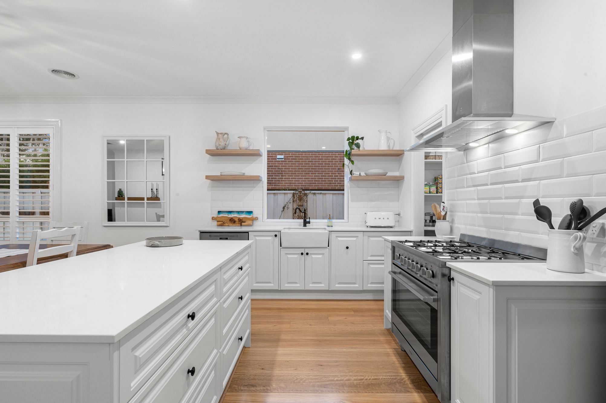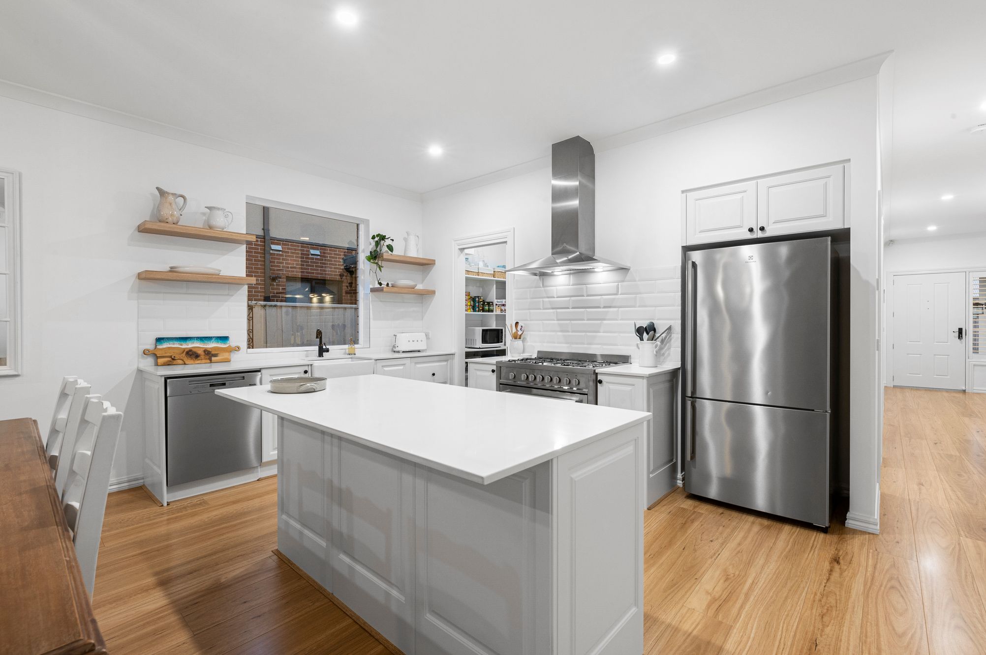 Kitchen: Island stone bench with overhang breakfast bar, 900mm gas cooktop with silent rangehood, custom shaker-style drawer kitchen cabinets, subway tile splashback, butlers farmhouse style sink with brass tapware, substantial feature picture window, floating shelving, solid brass pendant lighting, walk-in pantry with ample shelving & powerpoints, cavity slider, brass fittings, upgraded Miele dishwasher, high 2740mm ceilings, Blackbutt floating wood flooring, downlights