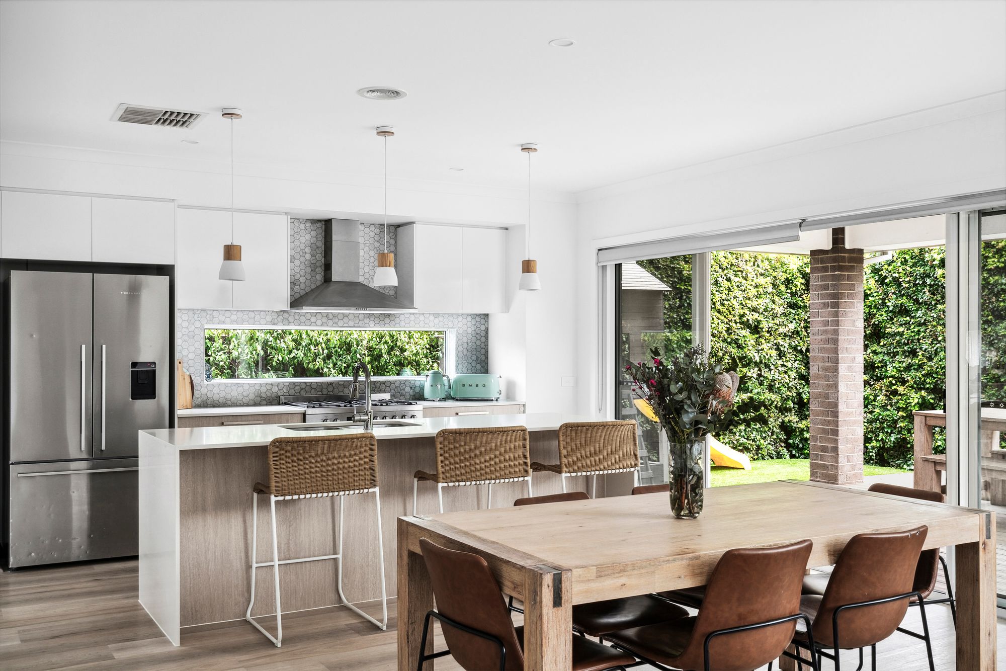 Kitchen: Generous walk-in pantry, large fridge cavity with plumbed tap connection, stone benchtops including a waterfall island & breakfast bar overhang enhanced by elegant pendant lighting, stainless-steel dual undermount sink, window and feature tiling splashback, overhead cupboards and pot drawers, 900mm oven & cooktop, dishwasher, timber hybrid flooring.