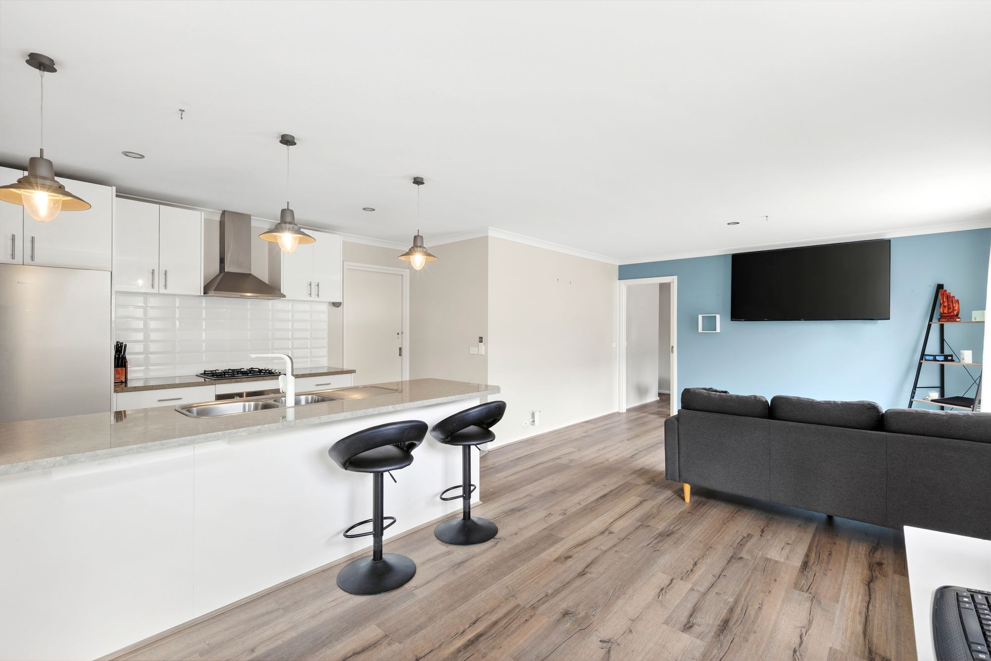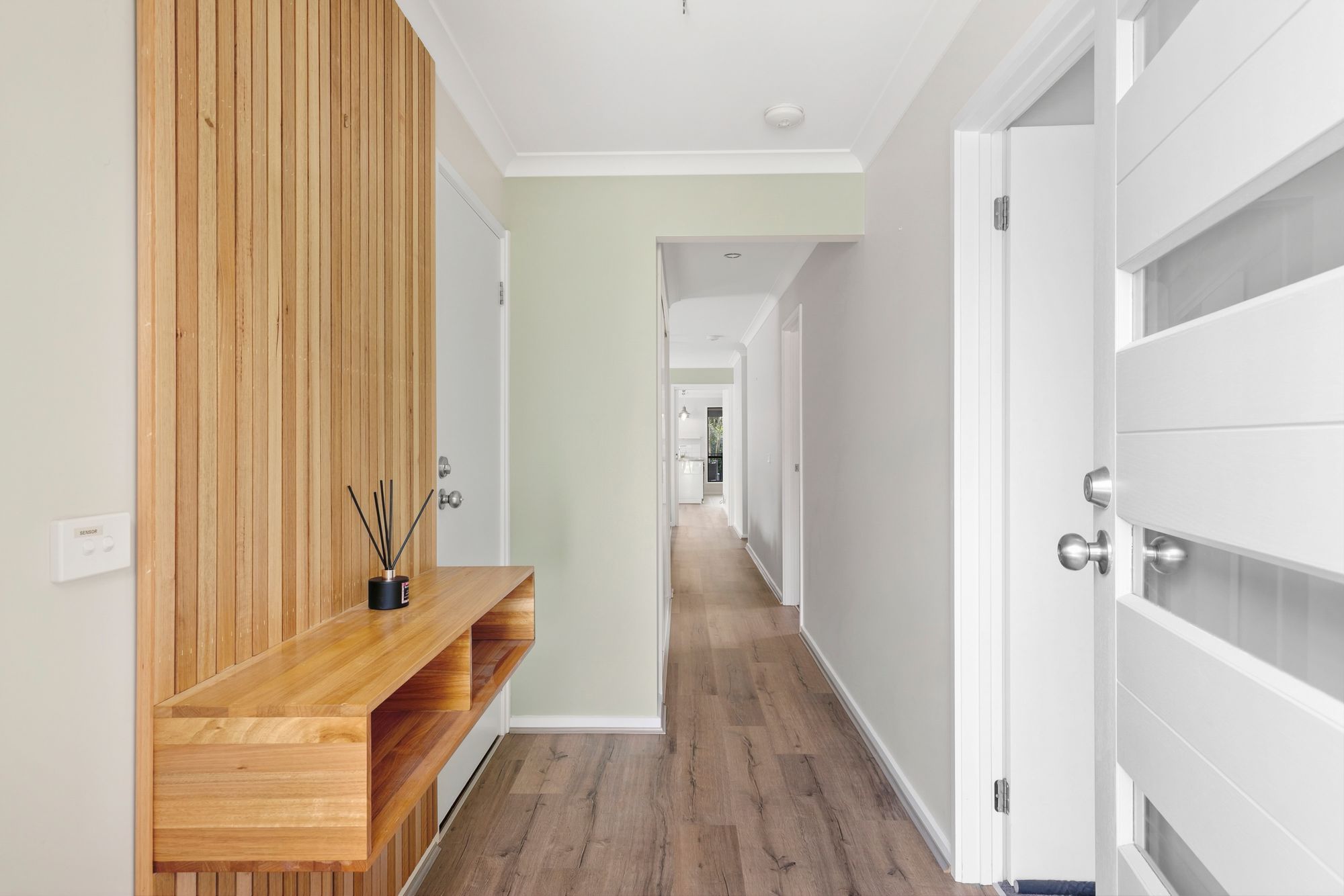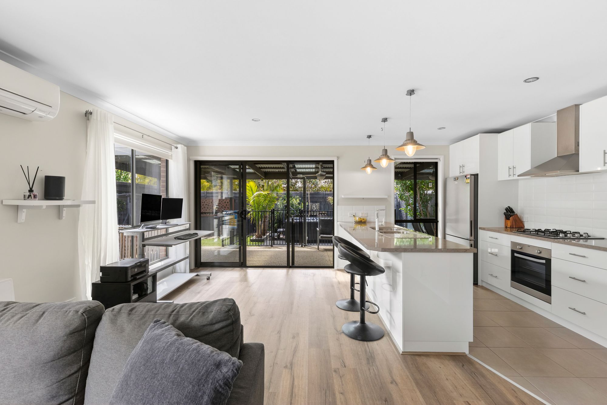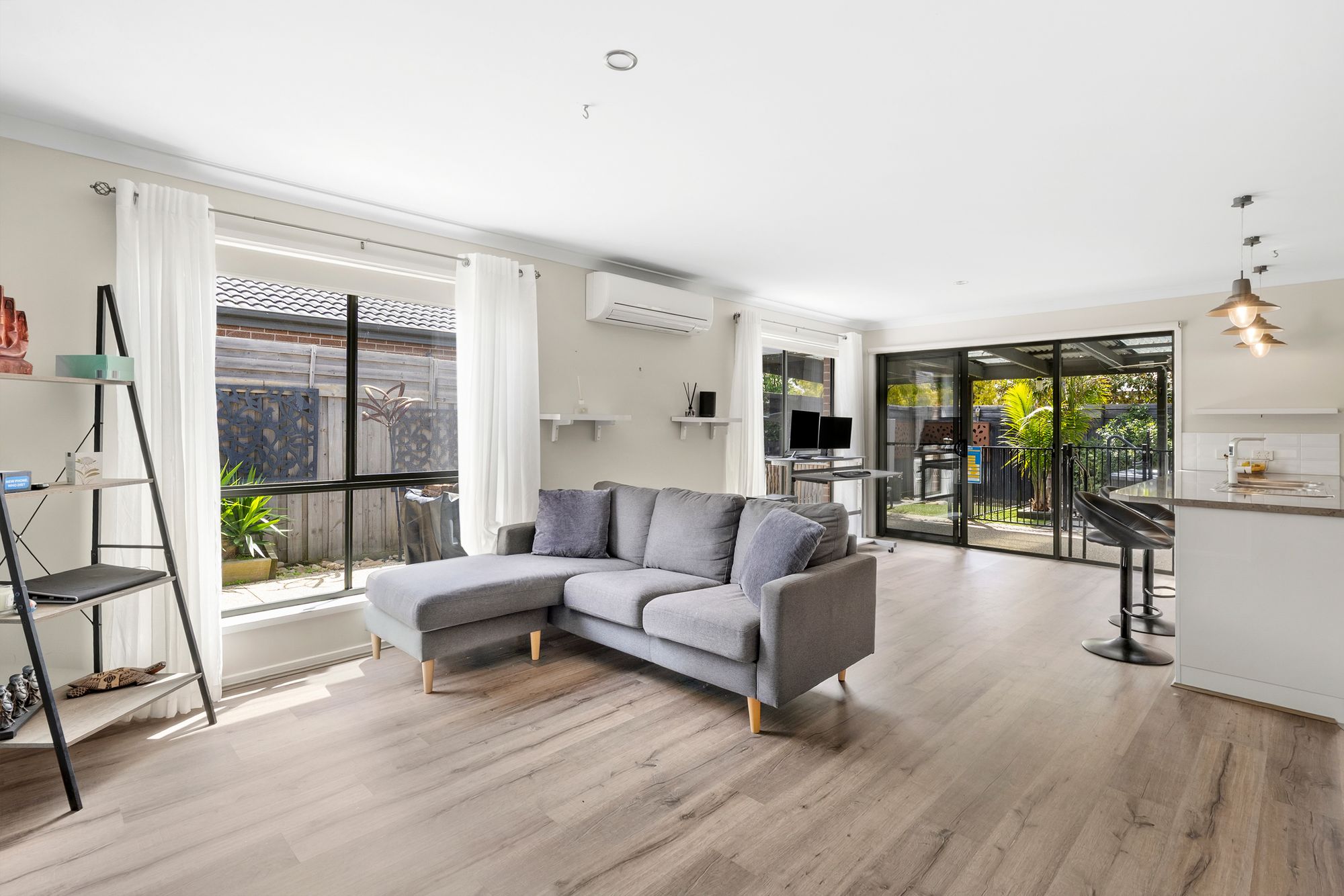 Living/dining: Split system air conditioning (heating and cooling), Rinnai heater, timber laminate, sheer curtains, roller blinds, sliding doors to external access, feature wall,