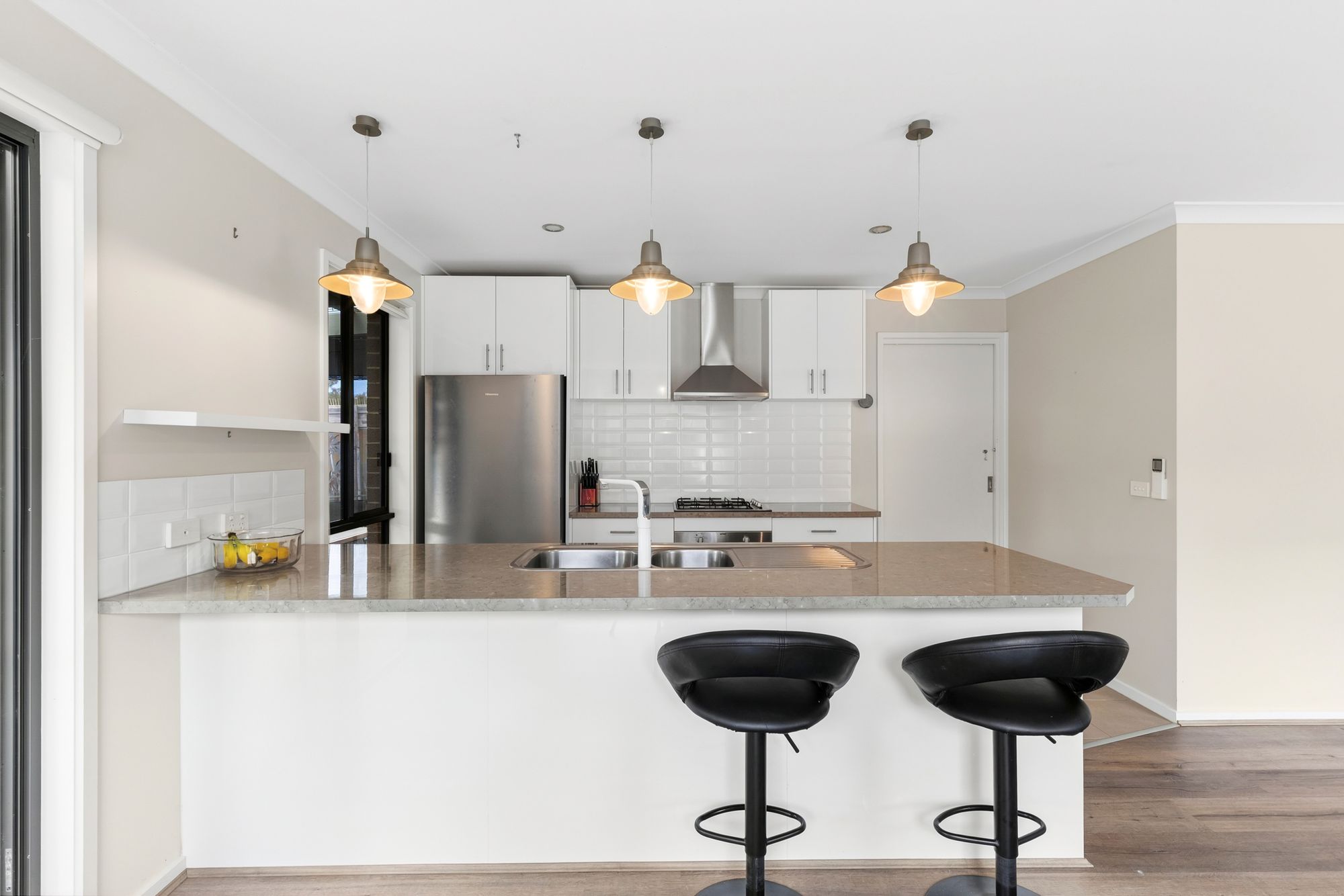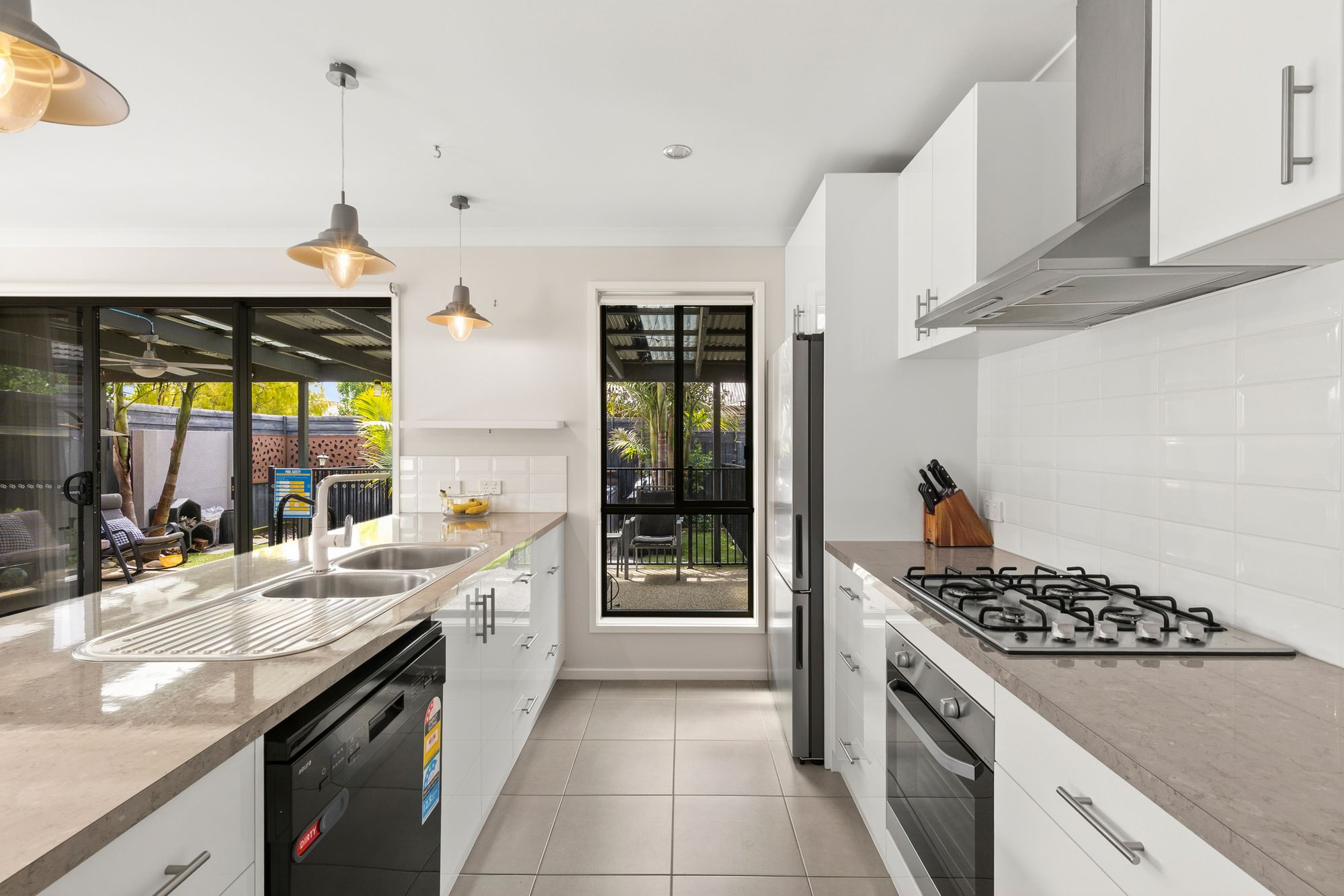Kitchen: Large walk in pantry with bench, 600mm built in appliances and range hood, upgraded tapware, pot drawers, dishwasher, overhead cabinetry, pendant lighting, downlights, fridge cavity, tiles.