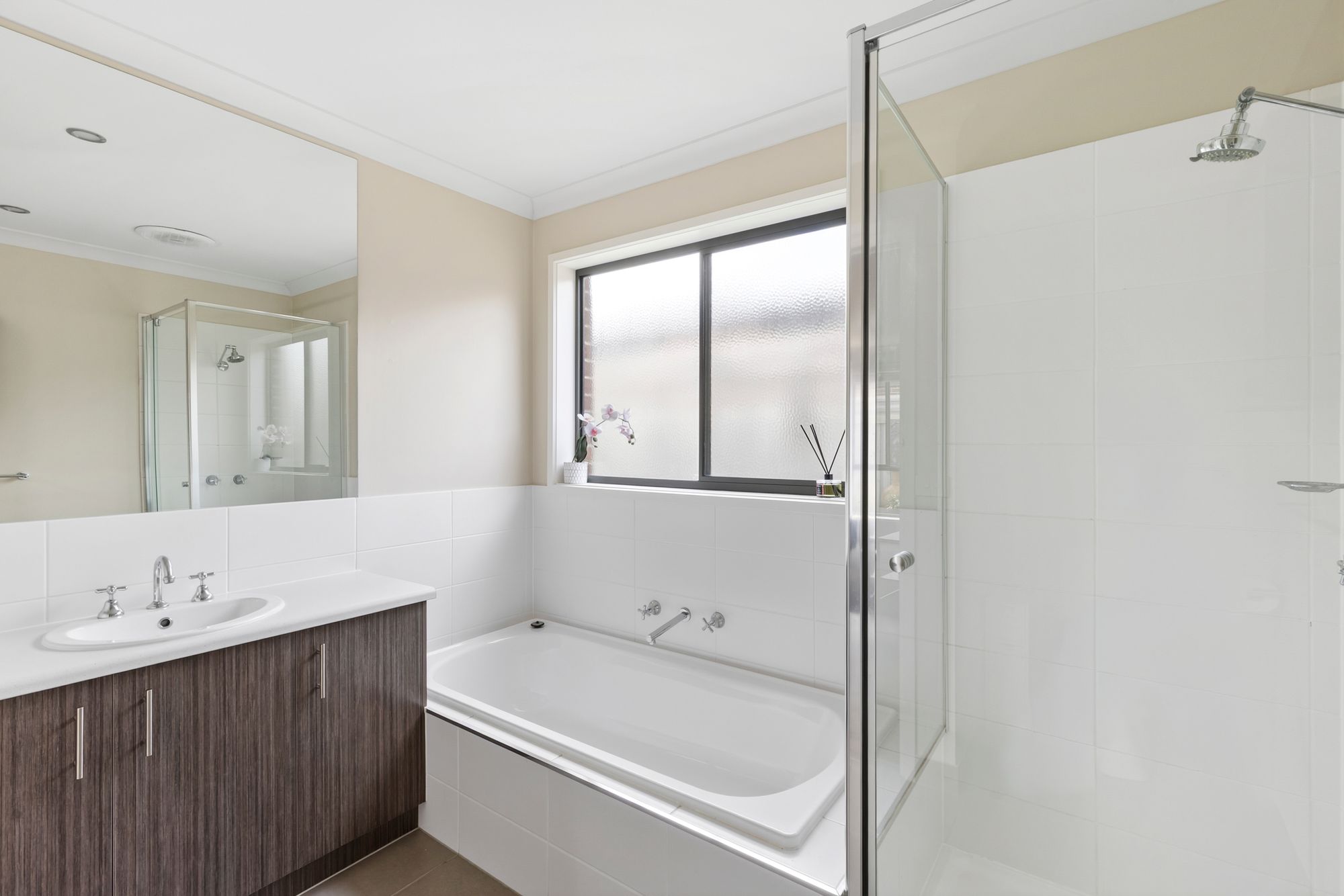 Main Bathroom: Bath, single vanity with ample storage, frosted glass windows, toilet, vanity vanity, semi-frameless shower, tiles, downlights.