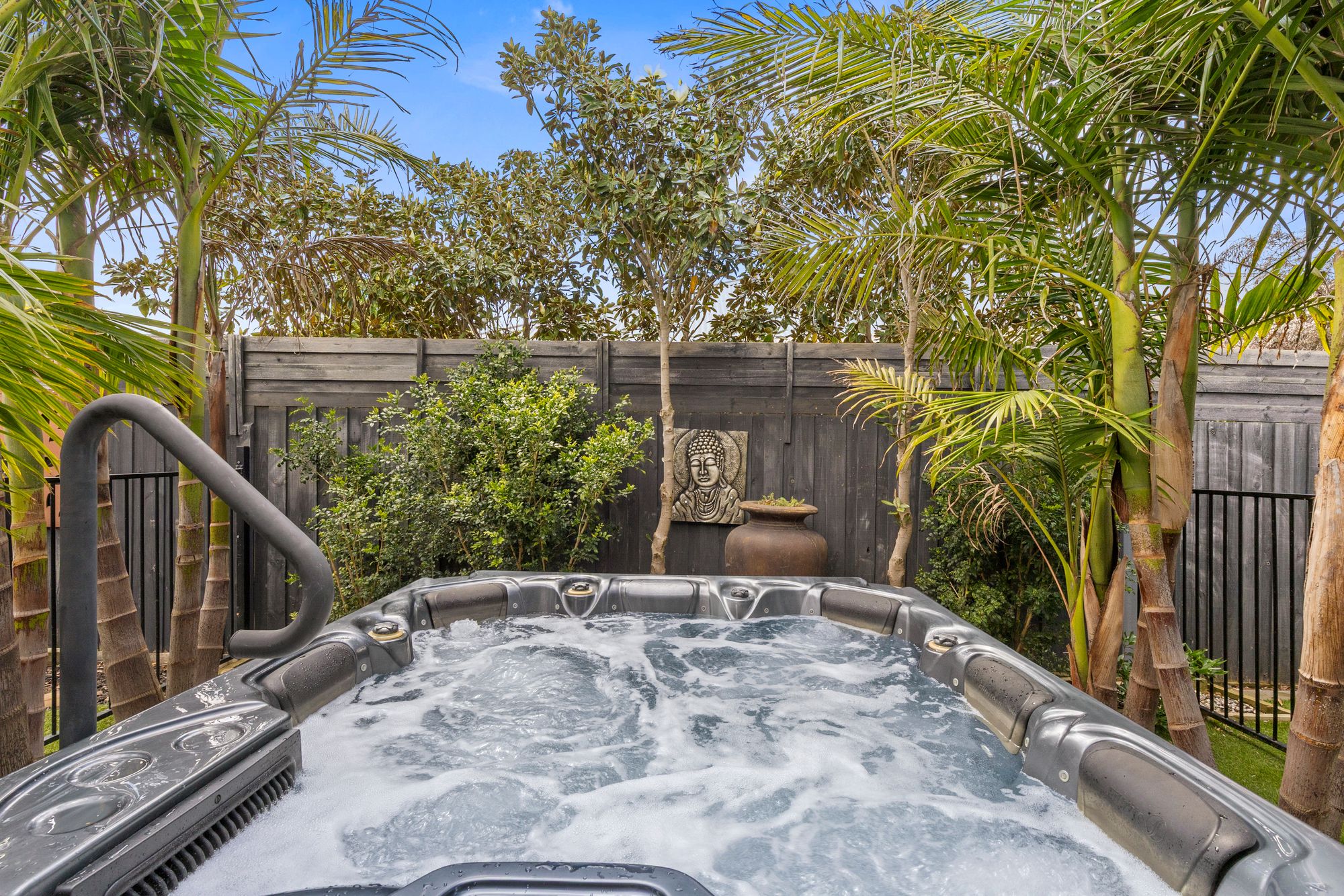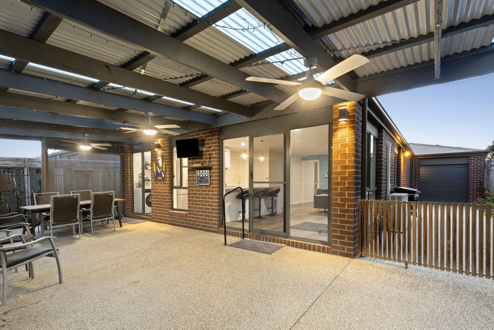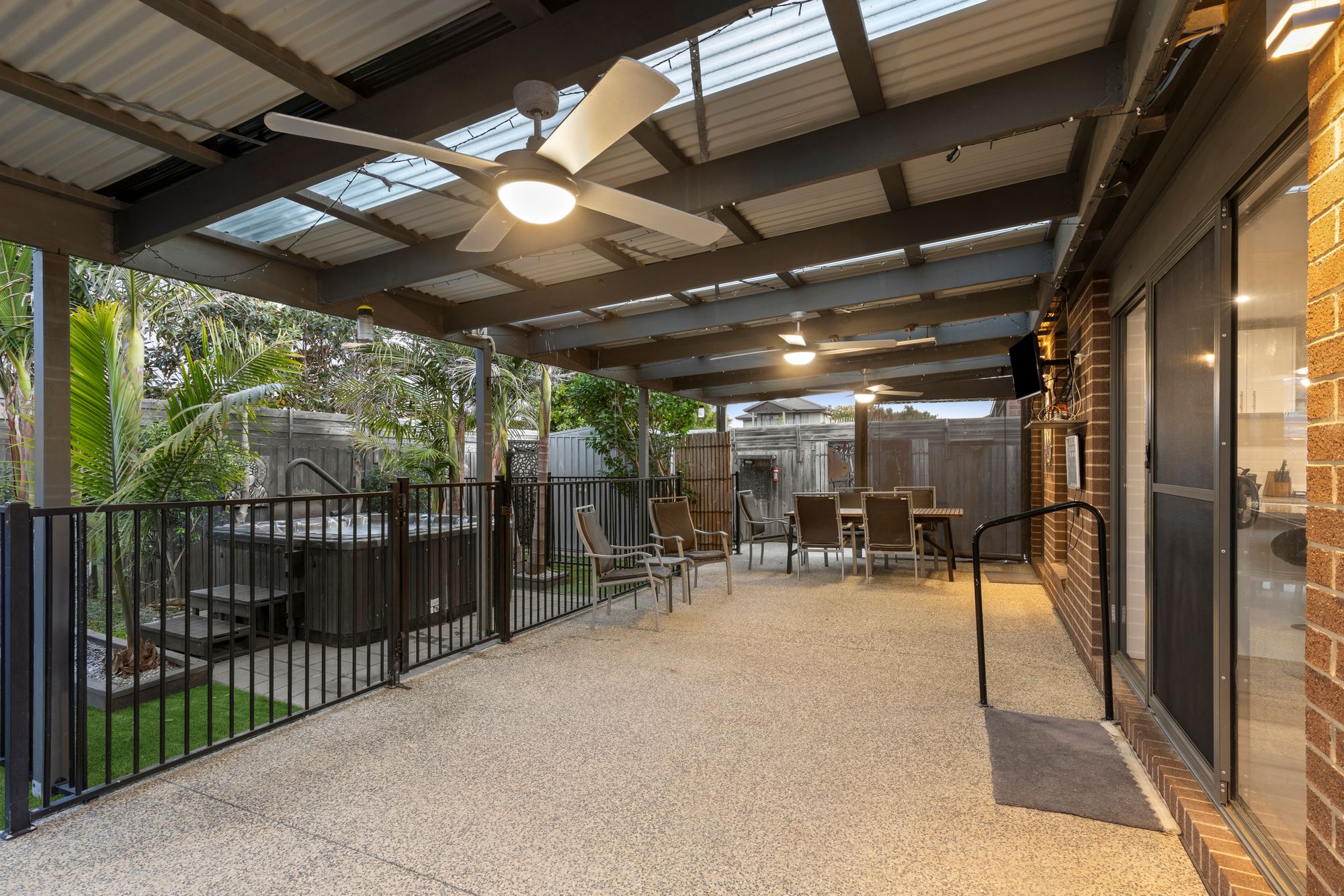 Outside: Outdoor entertaining with undercover extended pergola, spa, pool fence, aggregate concrete for rear roller door access, ceiling fans with lights, storage shed, clothes line, storage, synthetic turf, established gardens, landscaped front yard.