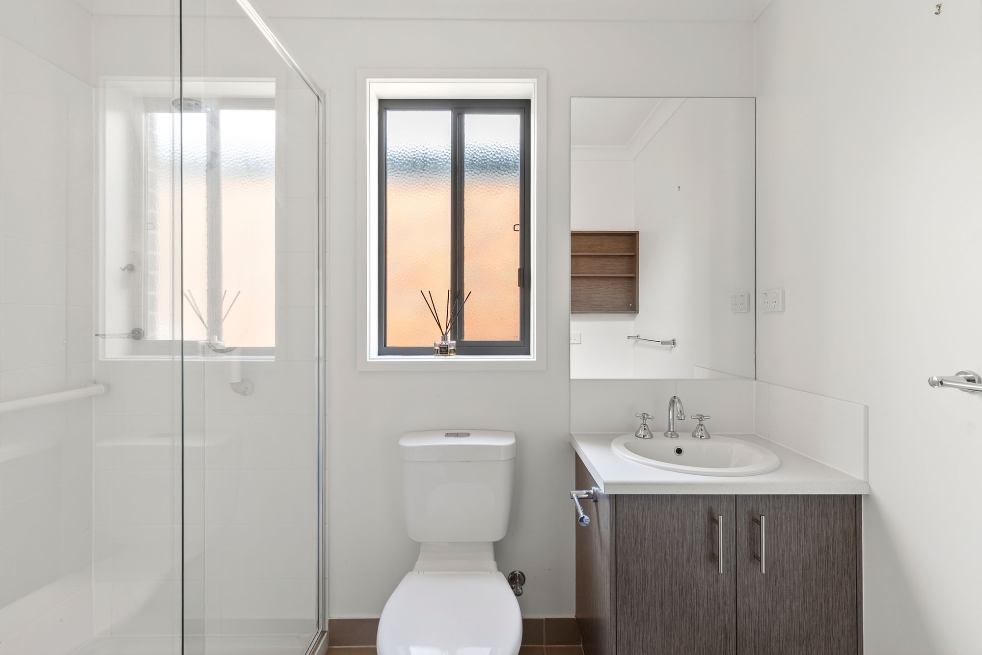 Ensuite: Double shower, hand held shower head, single vanity with ample storage, frosted glass, open toilet, downlights.