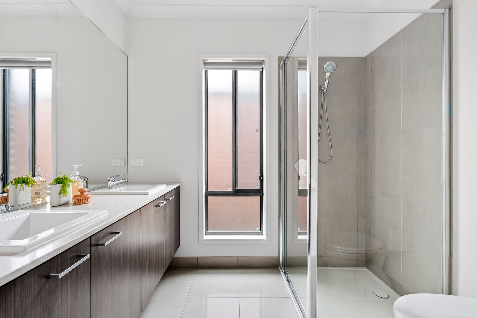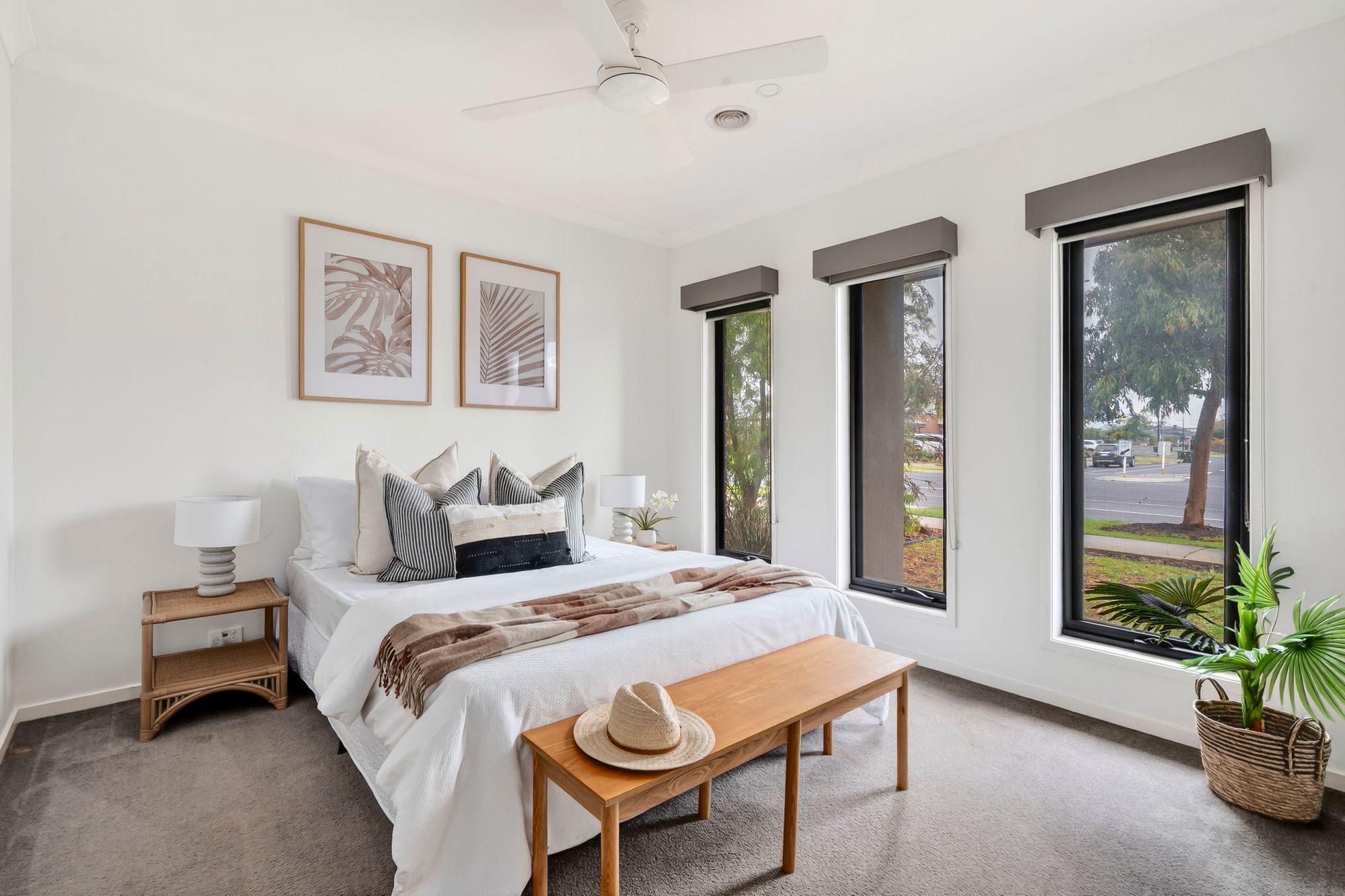 Master Suite: Generous in size, the master suite focus on relaxation and comfort. Consisting of West-facing windows with day and night blinds, lush carpet as well as ducted heating, ceiling fan and sizeable walk-in robe. The ensuite consists of a tiled shower with wall mounted and handheld showerhead, two single basins set on a 20mm stone benchtop vanity with underbench storage, frosted window with roller blind and toilet.