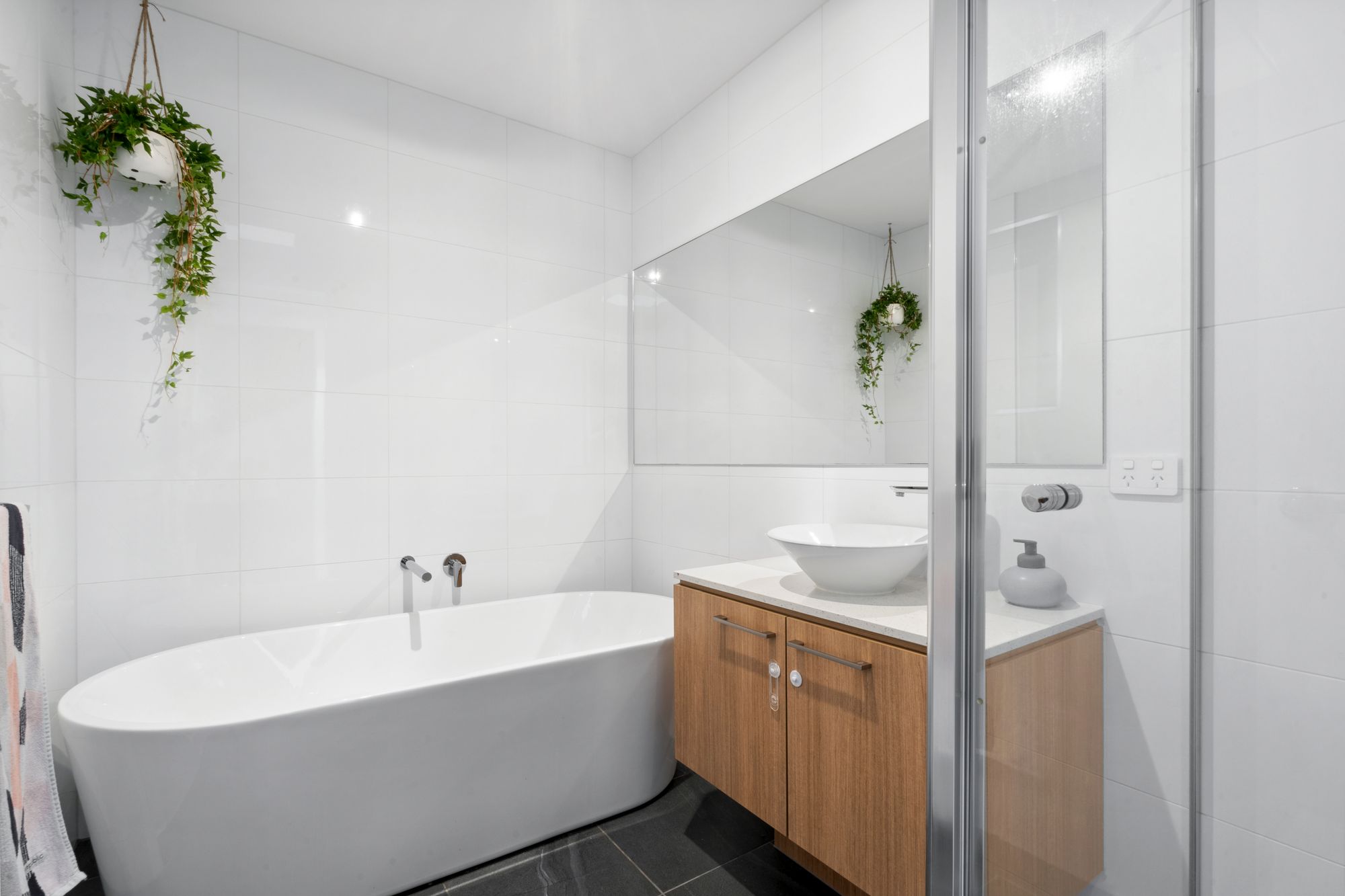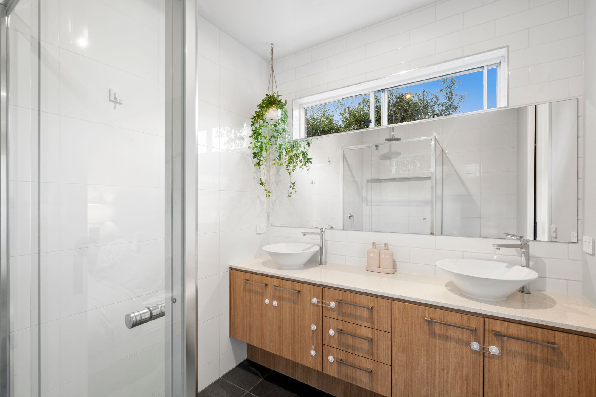 Additional Bathroom: Effortlessly servicing the household and the three bedrooms surrounding, the secondary bathroom homes floor to ceiling tiles, a single basin and 20mm stone benchtop vanity with tiled/mirrored splashback, freestanding bath, downlights and separate toilet.