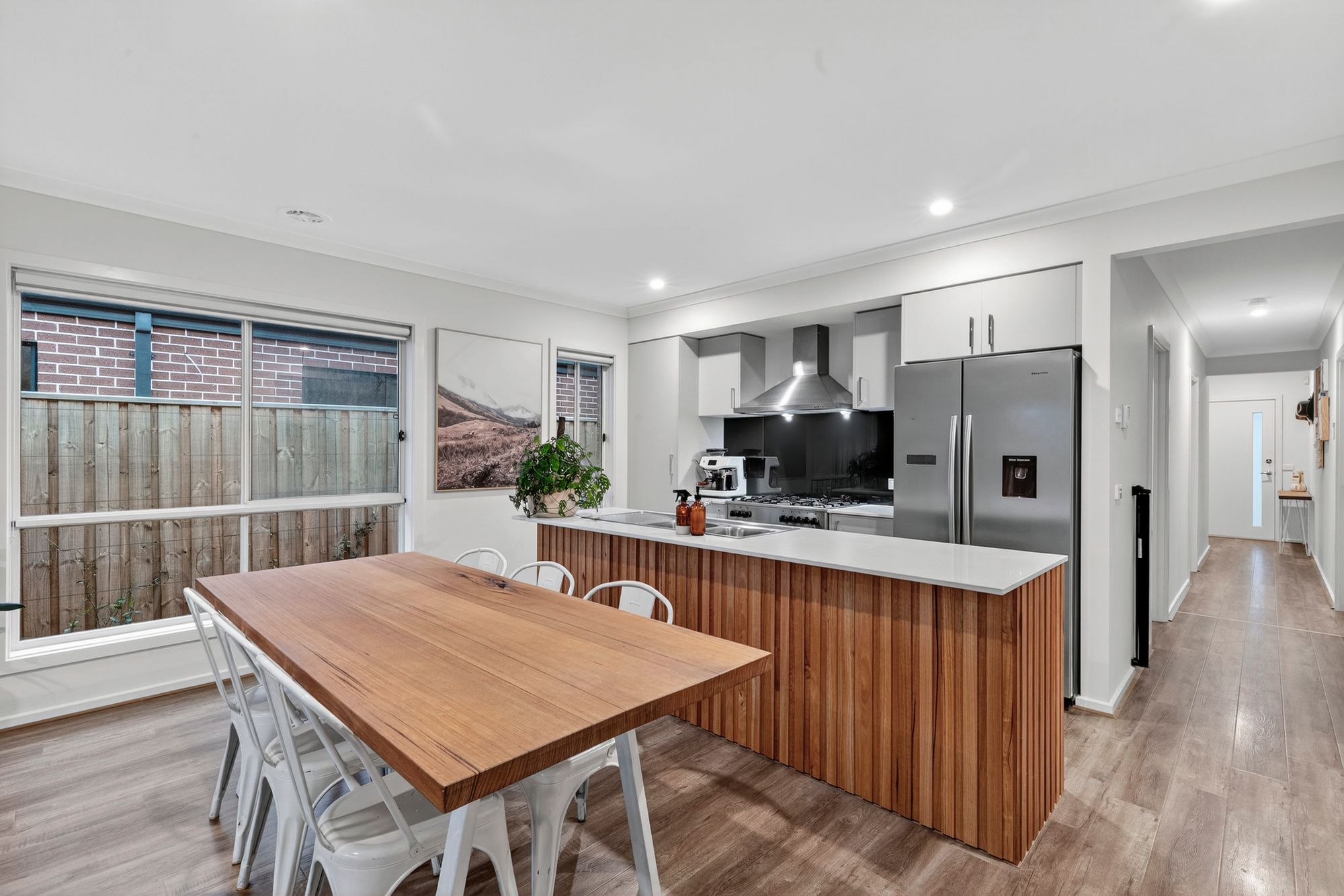 Kitchen: 900mm stainless steel gas cooktop, oven & integrated rangehood, built in pantry with shelving, 20mm stone benchtops, double sink with dish drainer, overhead cabinetry, storage drawers, feature glass splash back, microwave provision, timber laminate flooring, island bench with breakfast bar overhang with feature wooden detailing, dishwasher, downlights, ducted heating, split system cooling