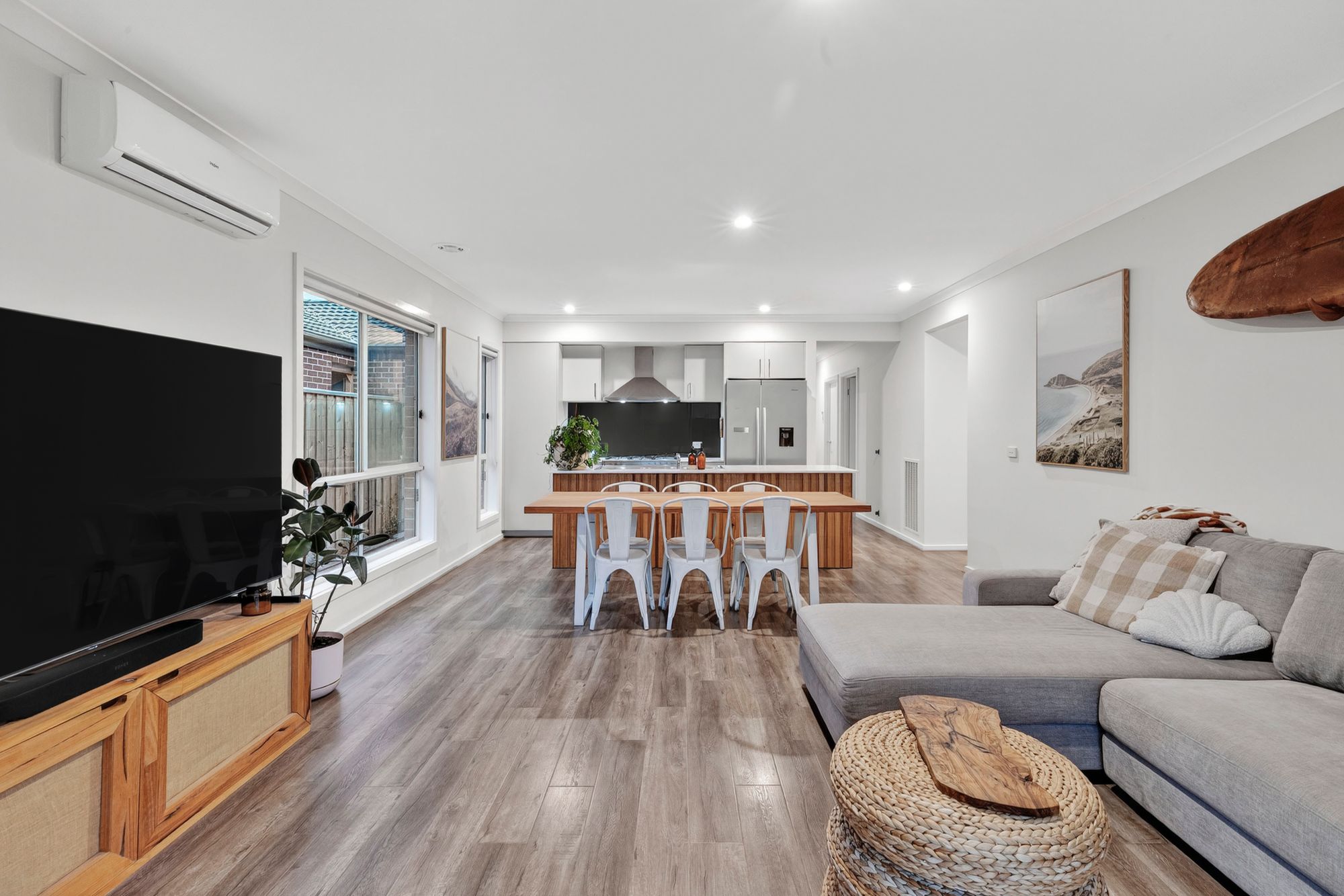 Living/dining: open plan kitchen/living/dining, expansive dining space, downlights, timber laminate flooring, ducted heating, split system cooling, downlights, large windows for lots of natural light with roller blinds, sliding glass doors through to undercover alfresco area creating an indoor/outdoor flow.