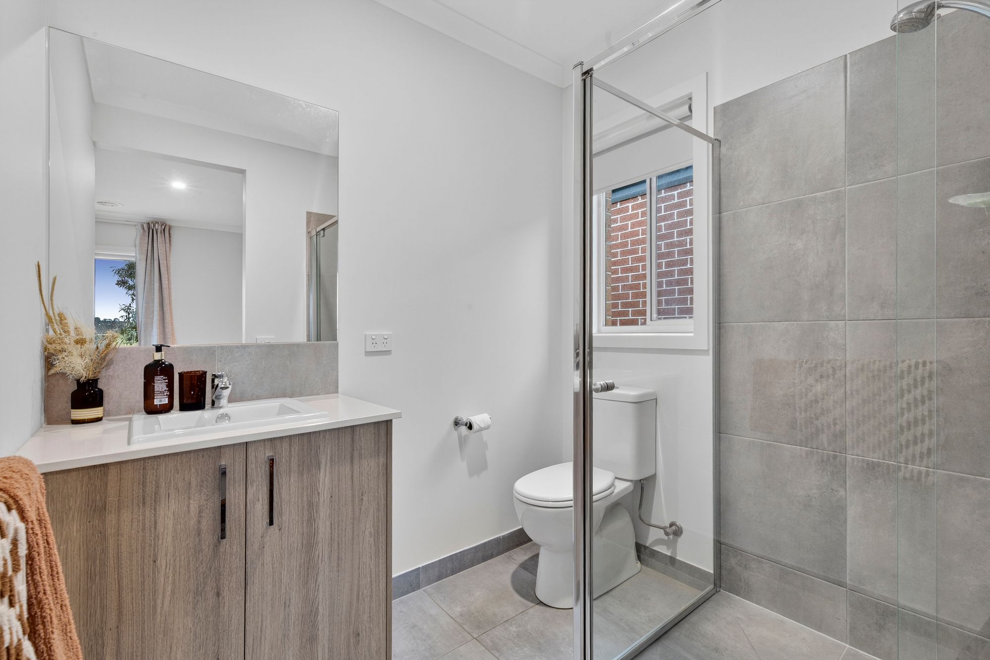 Ensuite with shower, tiles, stone bench top vanity with sink & storage underneath, mirror splash back, window and toilet.
