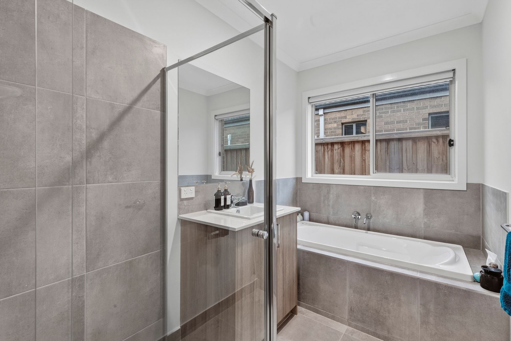 Main bathroom: tiled shower, bath, stone bench top vanity with sink & storage underneath, mirror splashback, seperate toilet