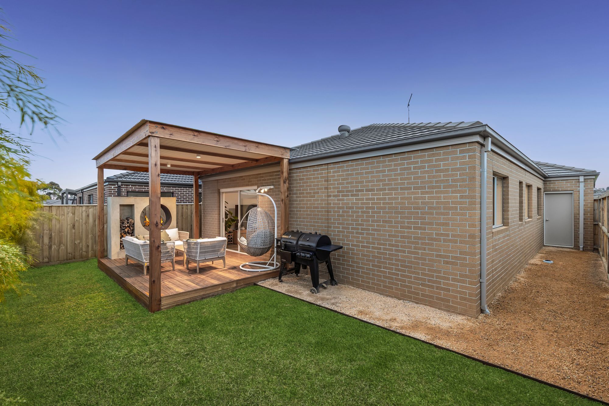 Outdoor: sliding glass doors leading to undercover alfresco area with custom deck, pergola, custom fireplace, and downlights, beautifully landscaped yard with established grass and plants, crushed rock surrounding home, side access with gate, external garage access, trees providing privacy, additional small garden bed on side of the home