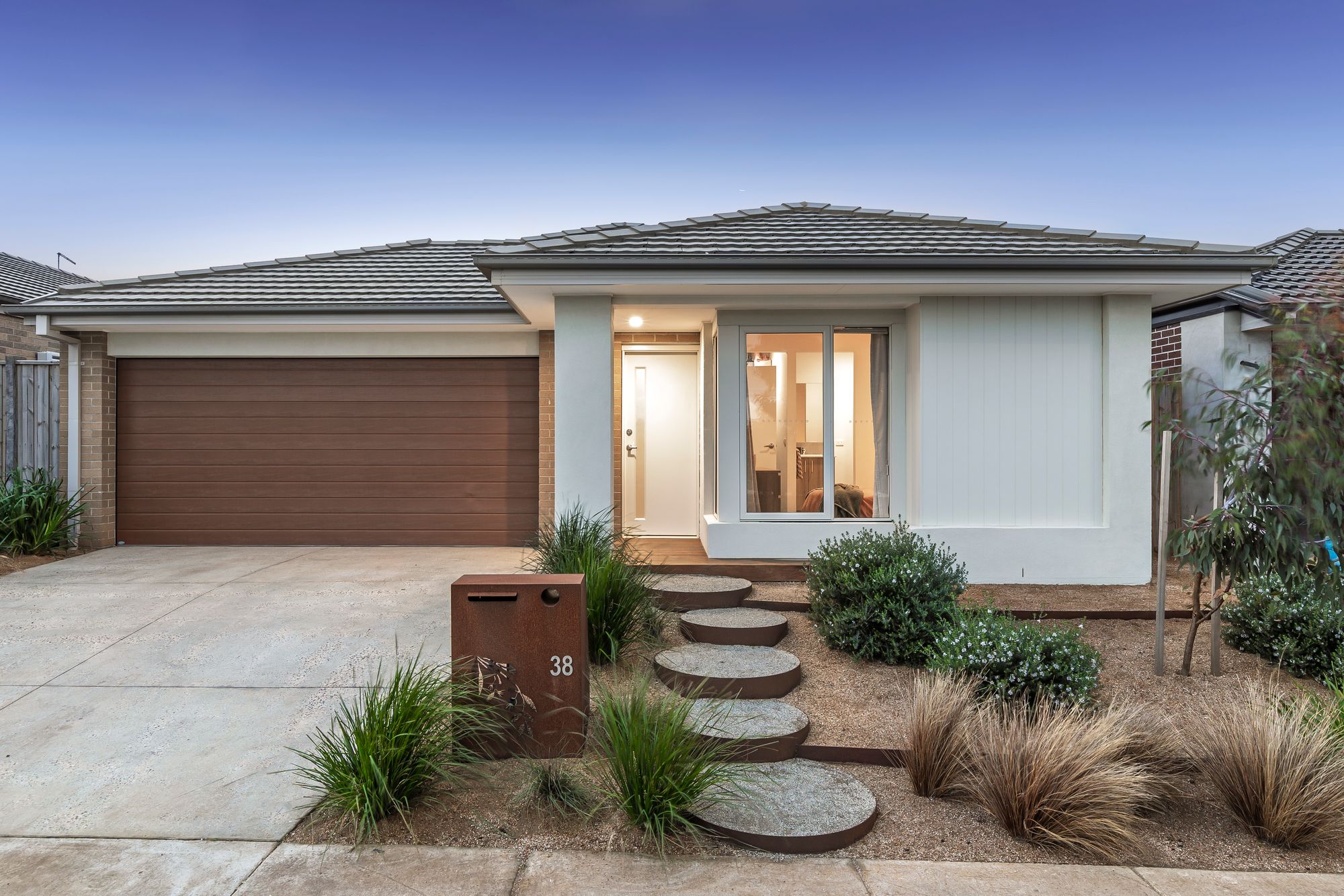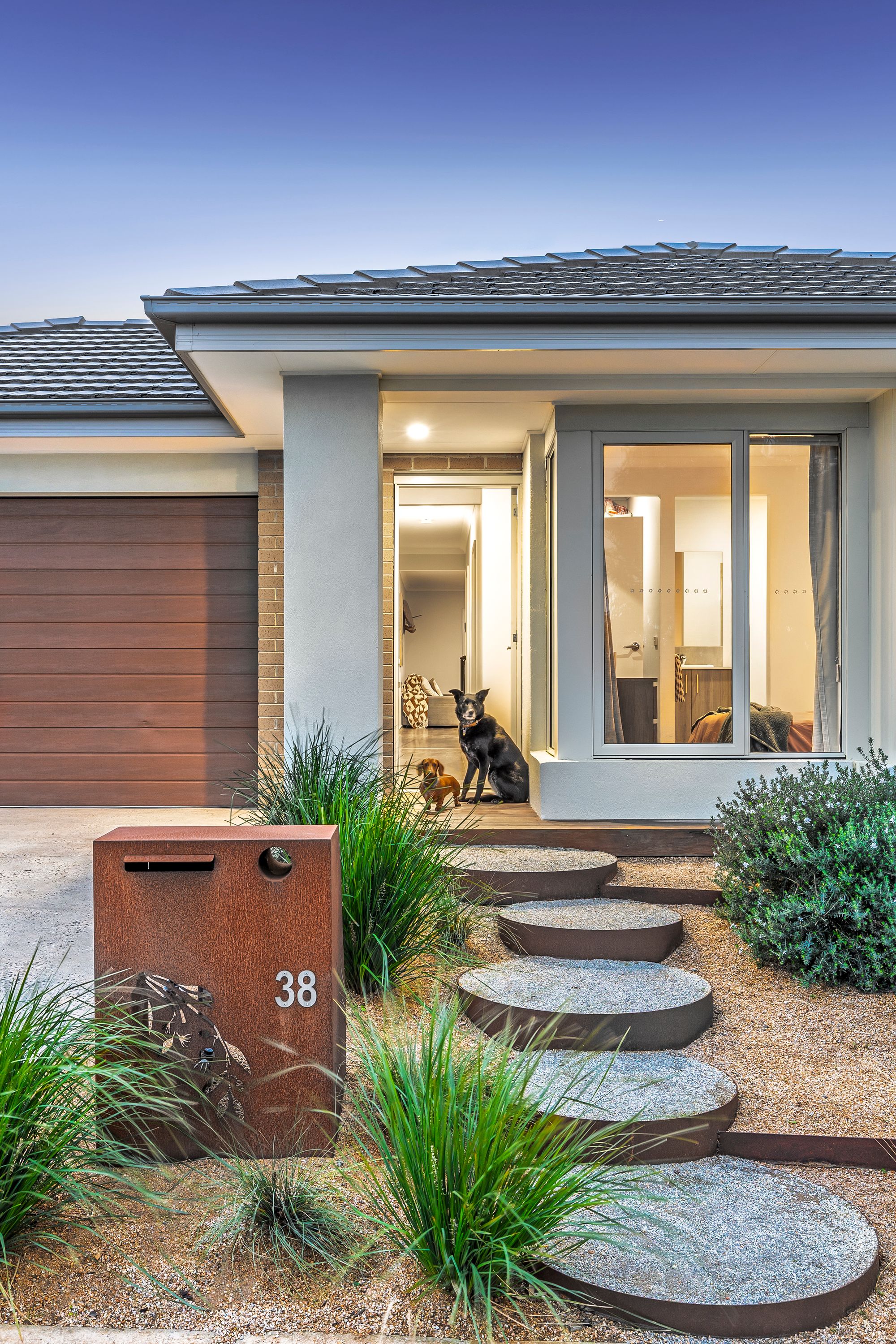 Mod cons: beautiful fully landscaped front yard featuring native plants & stepping stones, exposed stone driveway, ducted heating throughout, split system cooling in main living zone and master bedroom, side gate access, crushed rock surrounding home, custom outdoor pergola, deck and fireplace, clothesline, neutral coastal colour palette, double car lock-up garage with internal & external access, peaceful location within Mount Duneed