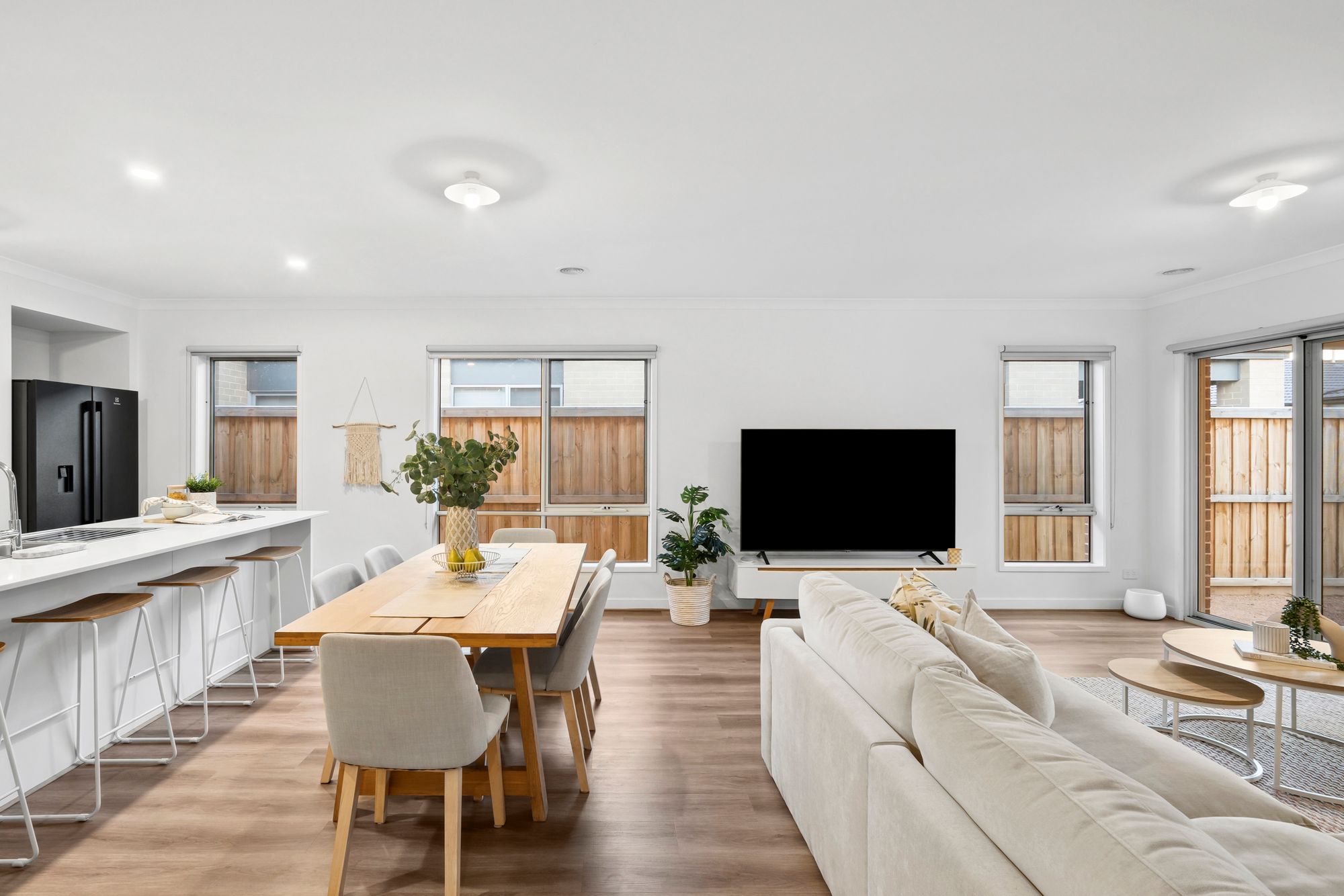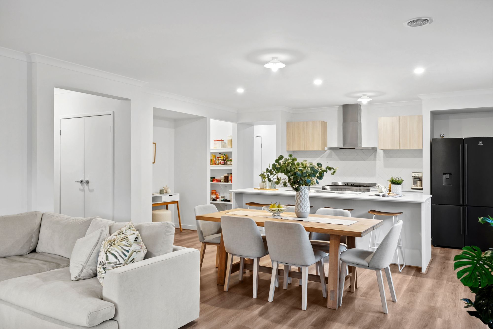 Living/Dining: Open plan, ducted heating, downlights and batten lights, timber hybrid flooring, windows with roller blinds, sliding glass doors open to the north facing outdoor alfresco creating an indoor/outdoor flow, raised ceiling.