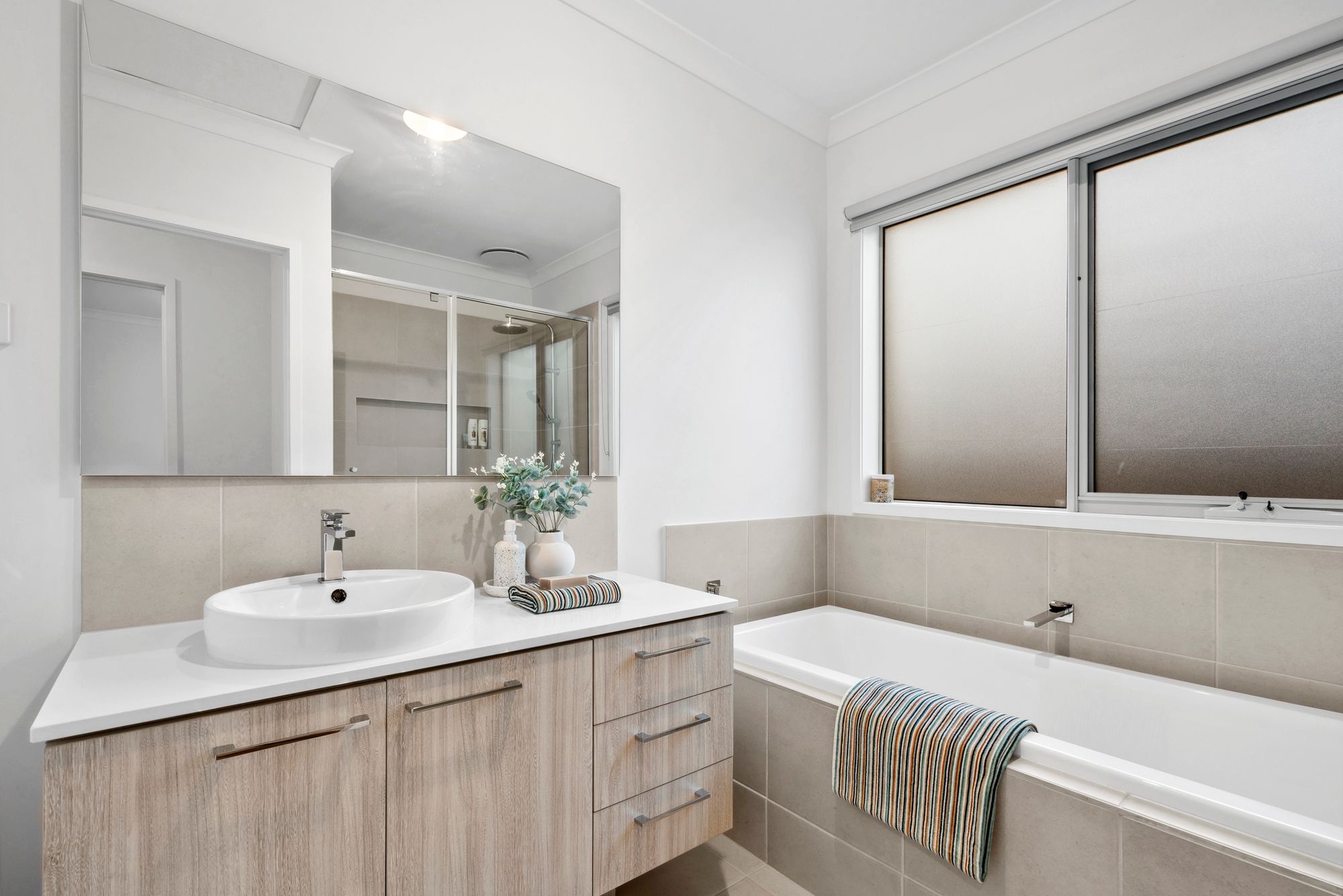 Master bedroom: carpet, sheer curtains, ducted heating, batten lights, walk in robe, Ensuite; Double semi-frameless shower, large mirror splash back, wall to wall twin vanity with ample storage, 20m stone benchtop, chrome fittings, toilet.