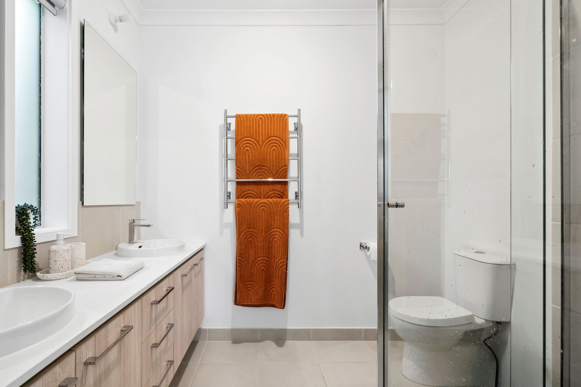 Main bathroom: Tiled, semi frameless shower, single basin and vanity with extended mirror splashback, 20mm stone benchtops, chrome fittings, separate toilet.