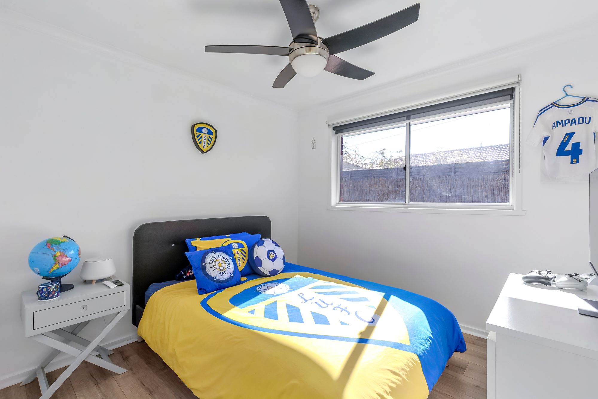 Additional bedroom: timber laminate flooring, window with roller blind, ceiling fan, built in robe with shelving.