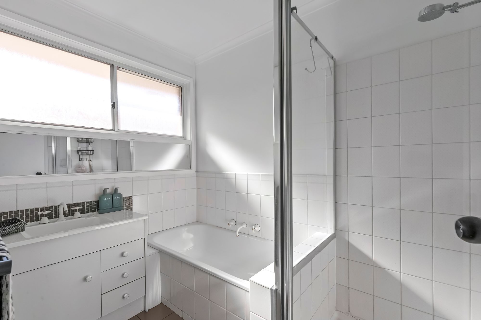 Main bathroom: Semi frameless shower, bath, tiles, mirror, basin and vanity with storage, window with frosted glass, separate toilet, towel rail.