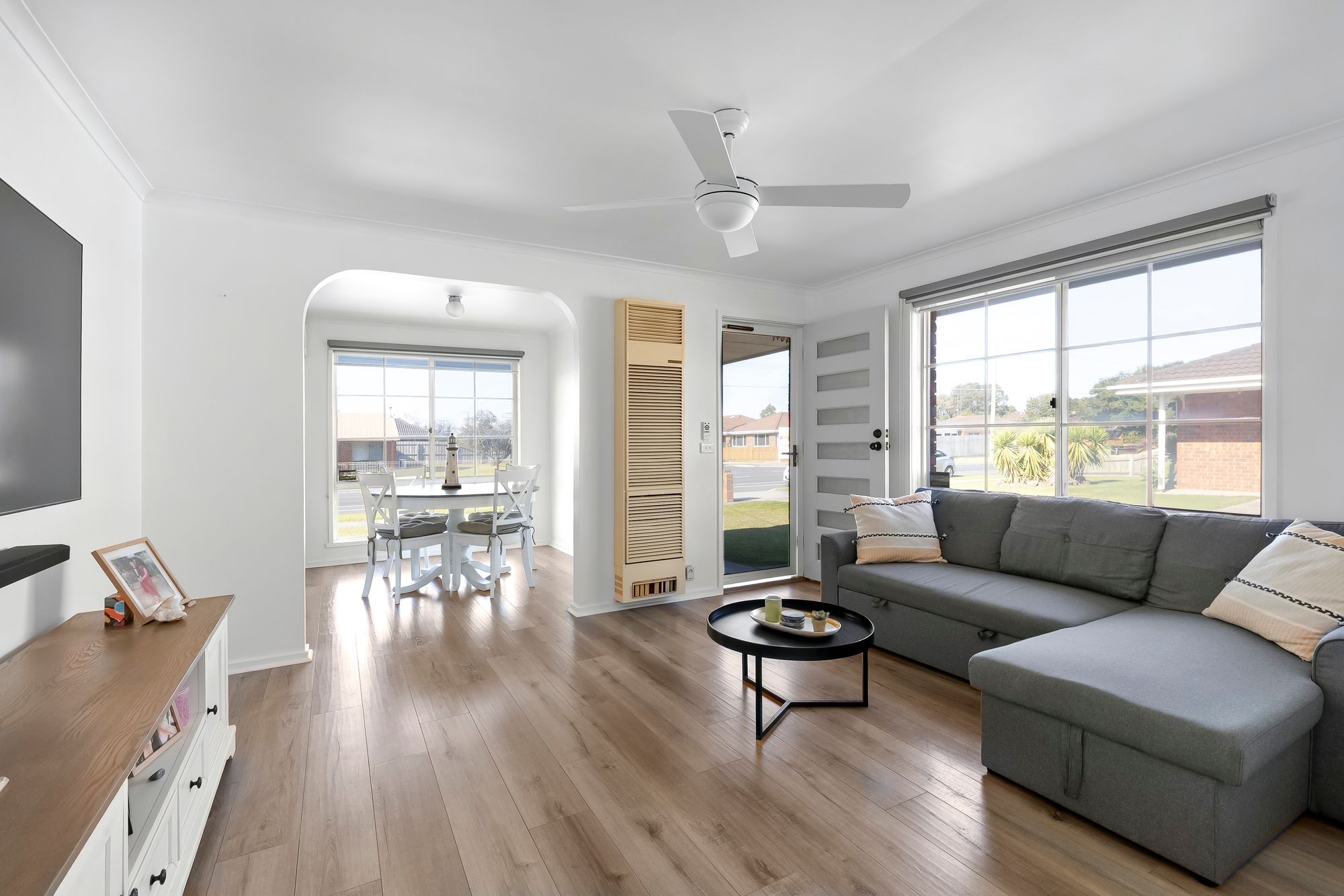 Living/dining: timber laminate flooring, blinds to all windows, split system heating and cooling, ceiling fan