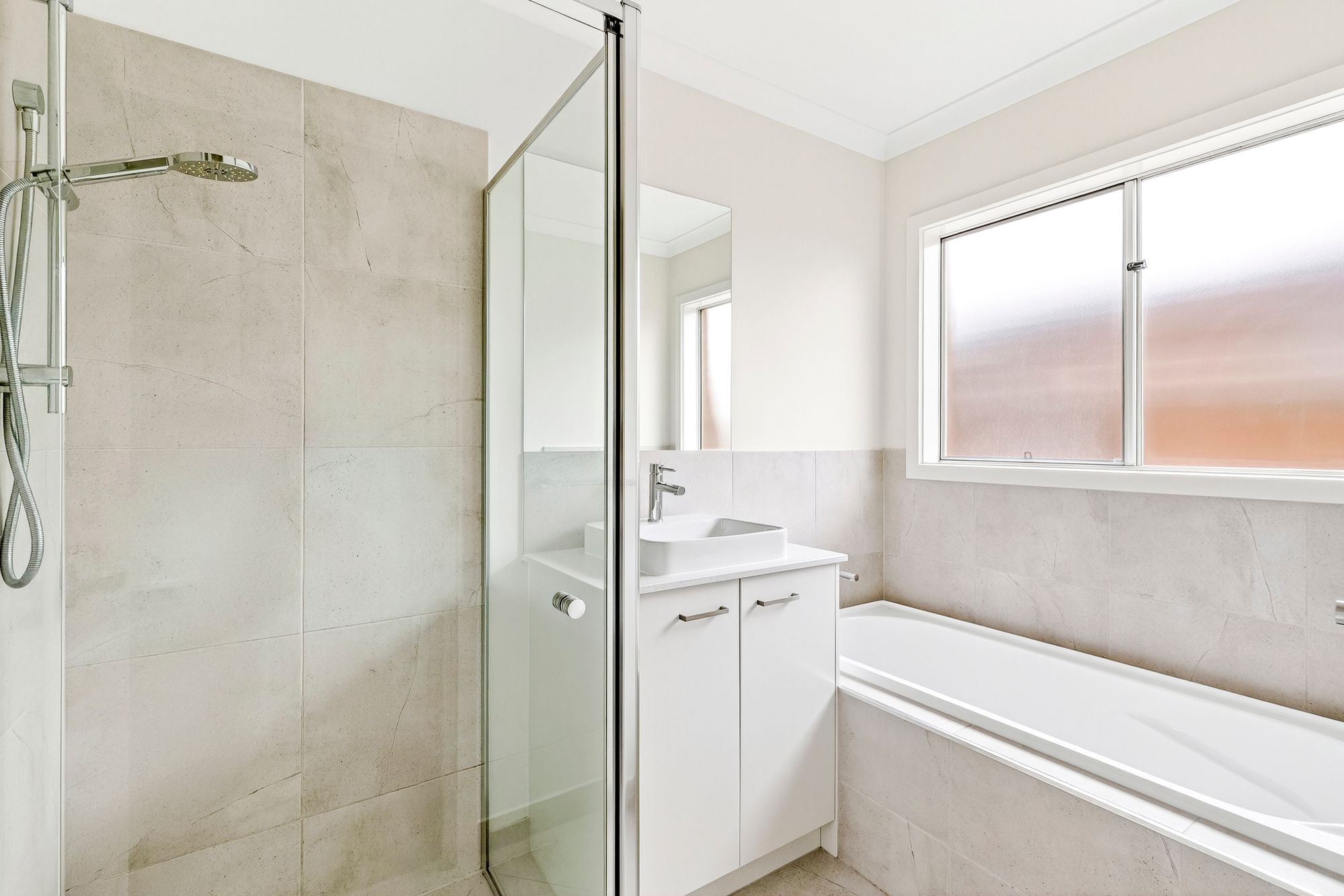 Main bathroom: Bath with upgraded wall mounted tap, semi frameless shower, 20mm stone benchtop vanity with basin & mirror splashback, chrome fittings, frosted window & seperate toilet.