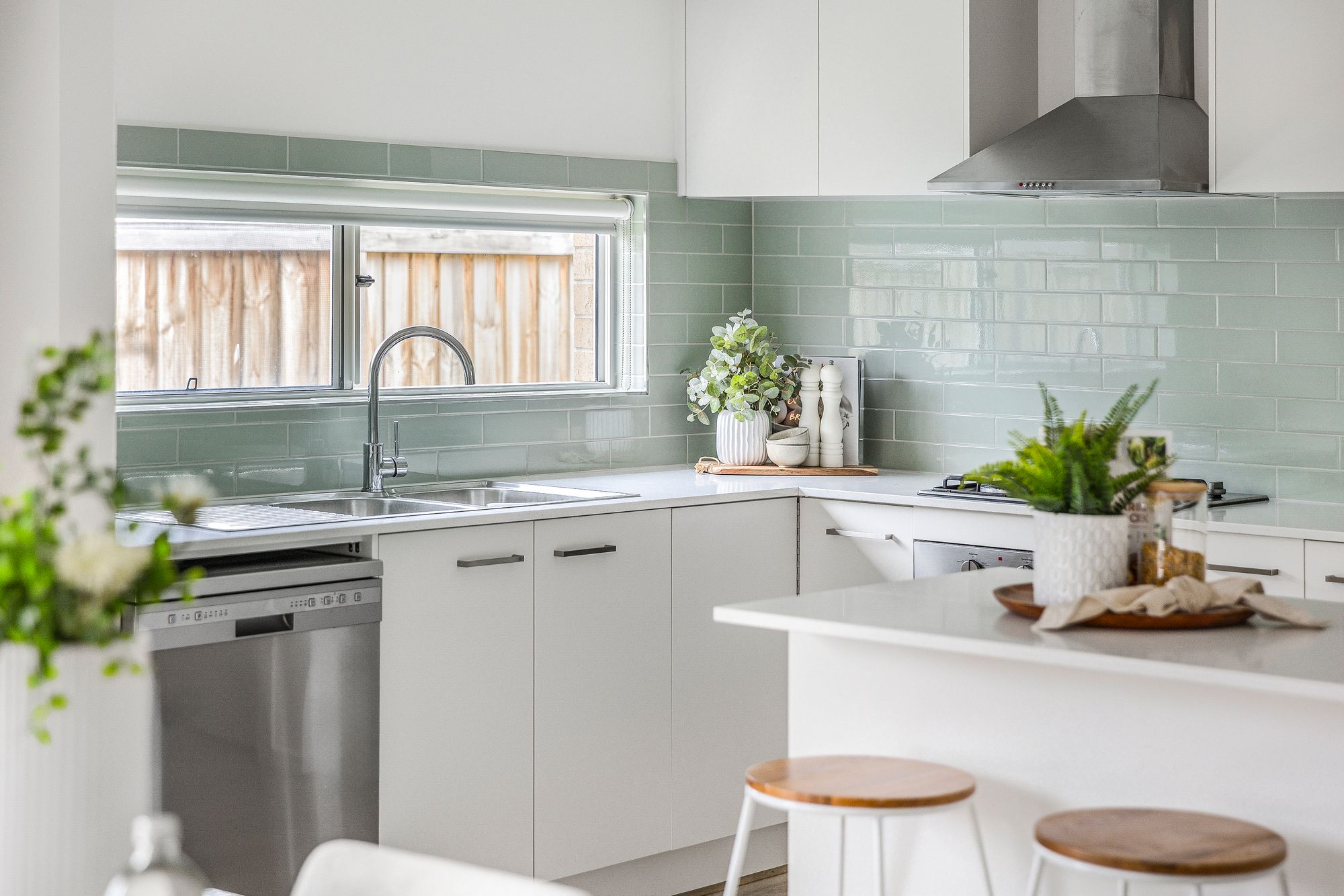 Kitchen: 20mm stone benchtops with island and breakfast bar, dual sink with upgraded tapware, 600mm gas cooktop/oven & rangehood, subway tiling splashback, feature window splashback, microwave cavity, fridge cavity with overhead cabinetry, dishwasher, downlights, walk-in pantry, ample storage & overhead cabinetry, roller blinds & timber laminate flooring.