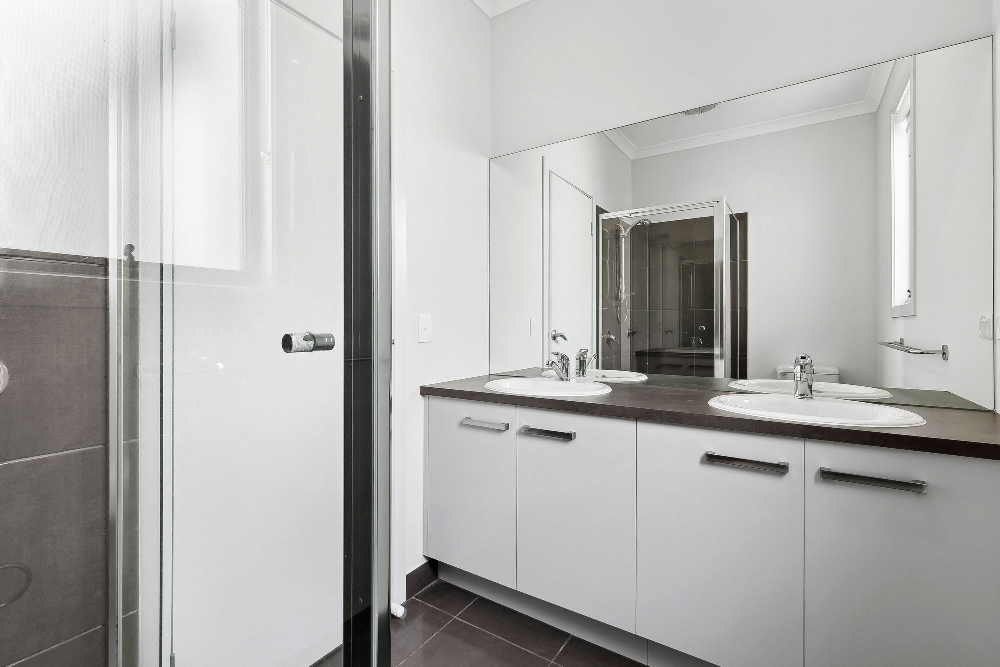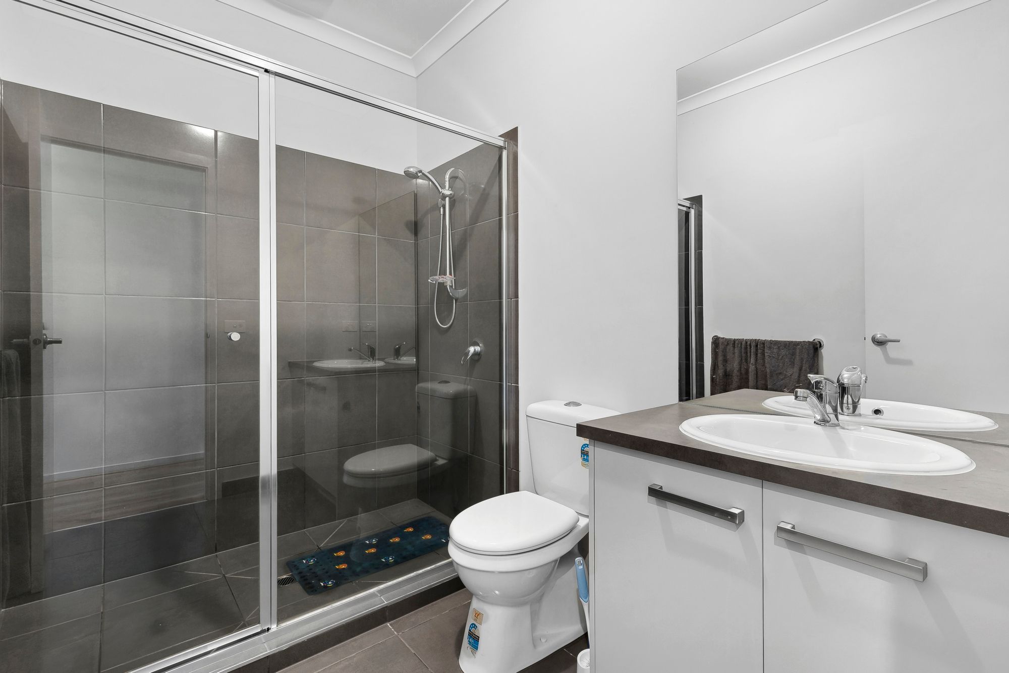 Main bathroom- single vanity with mirror, large shower, toilet