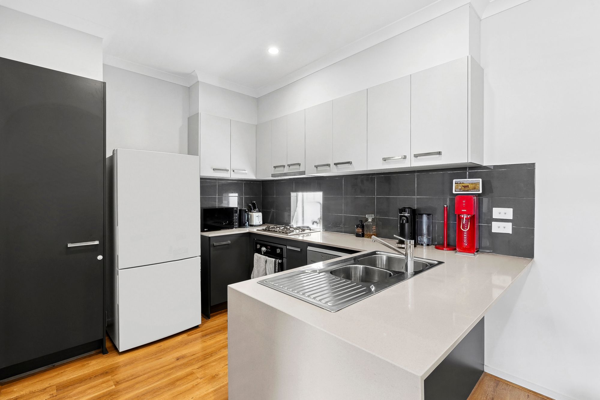 Kitchen- 400mm gas cooktop, oven & rangehood, tile splash back, stainless steel appliances, pendant lighting, dishwasher & cupboard pantry
