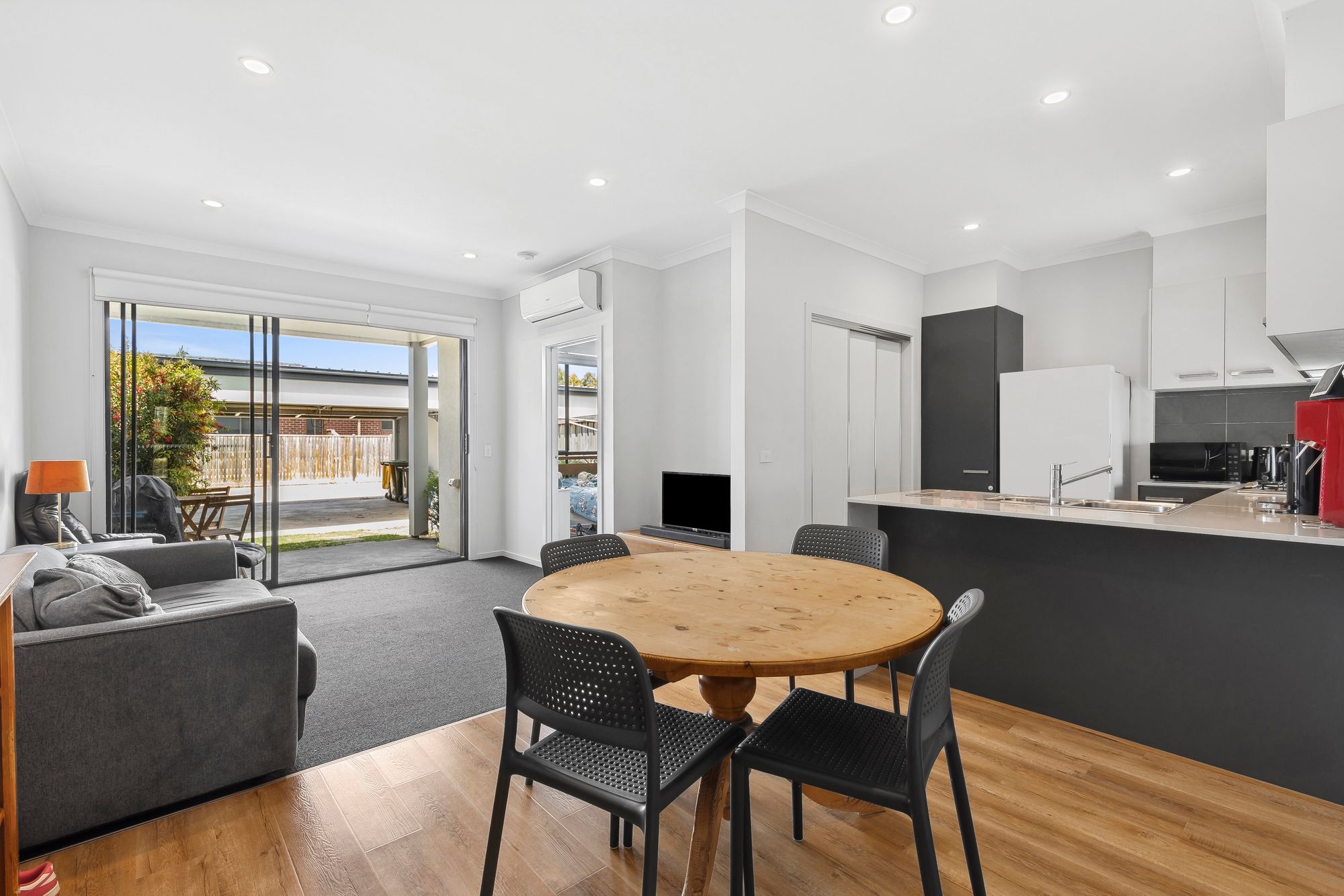 Living- open plan, adjoining living, dining & kitchen, ducted heating, timber laminate flooring throughout, nook, roller blinds, glass sliding doors open up from living to outdoor grass area following to open garage