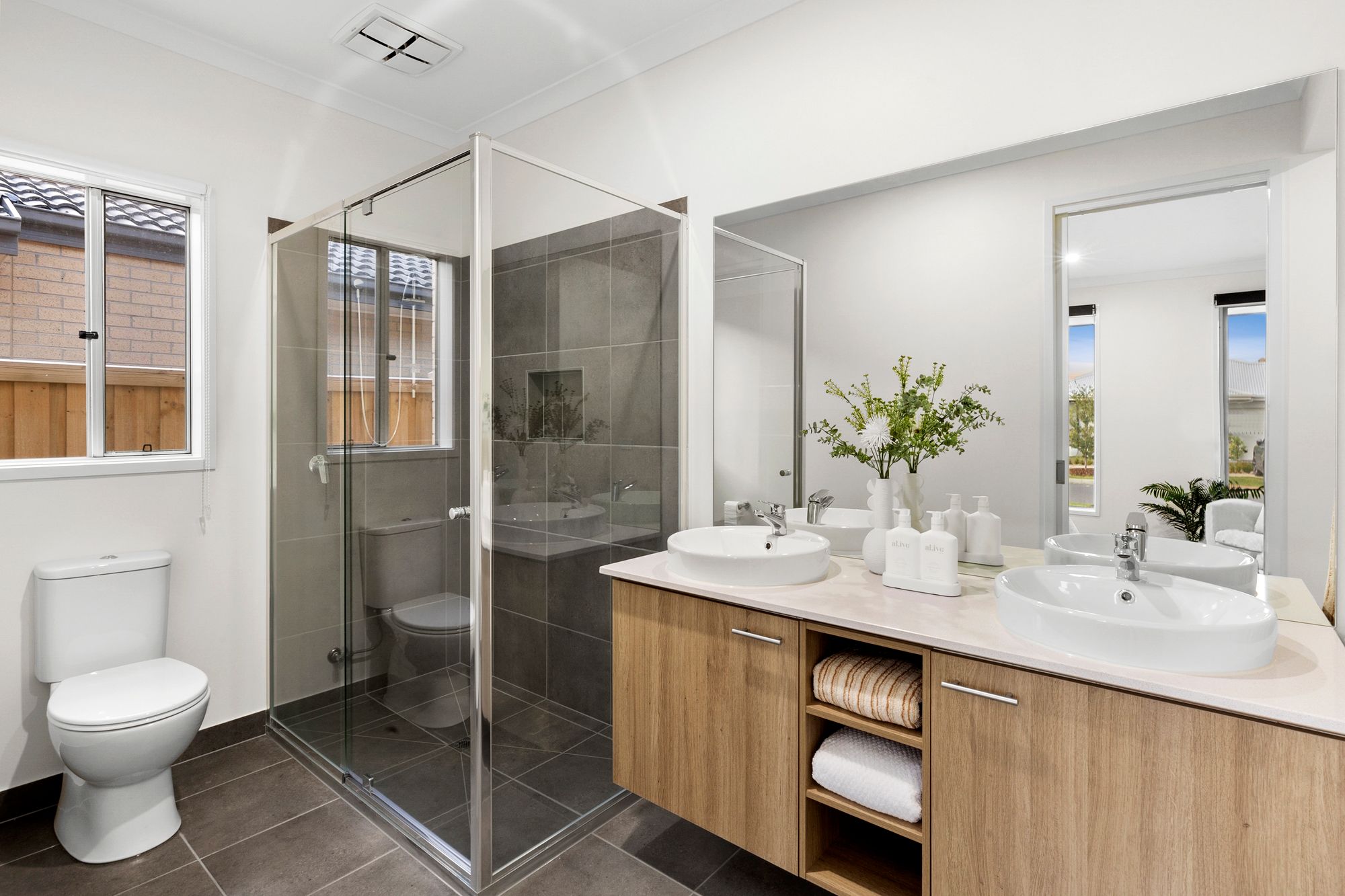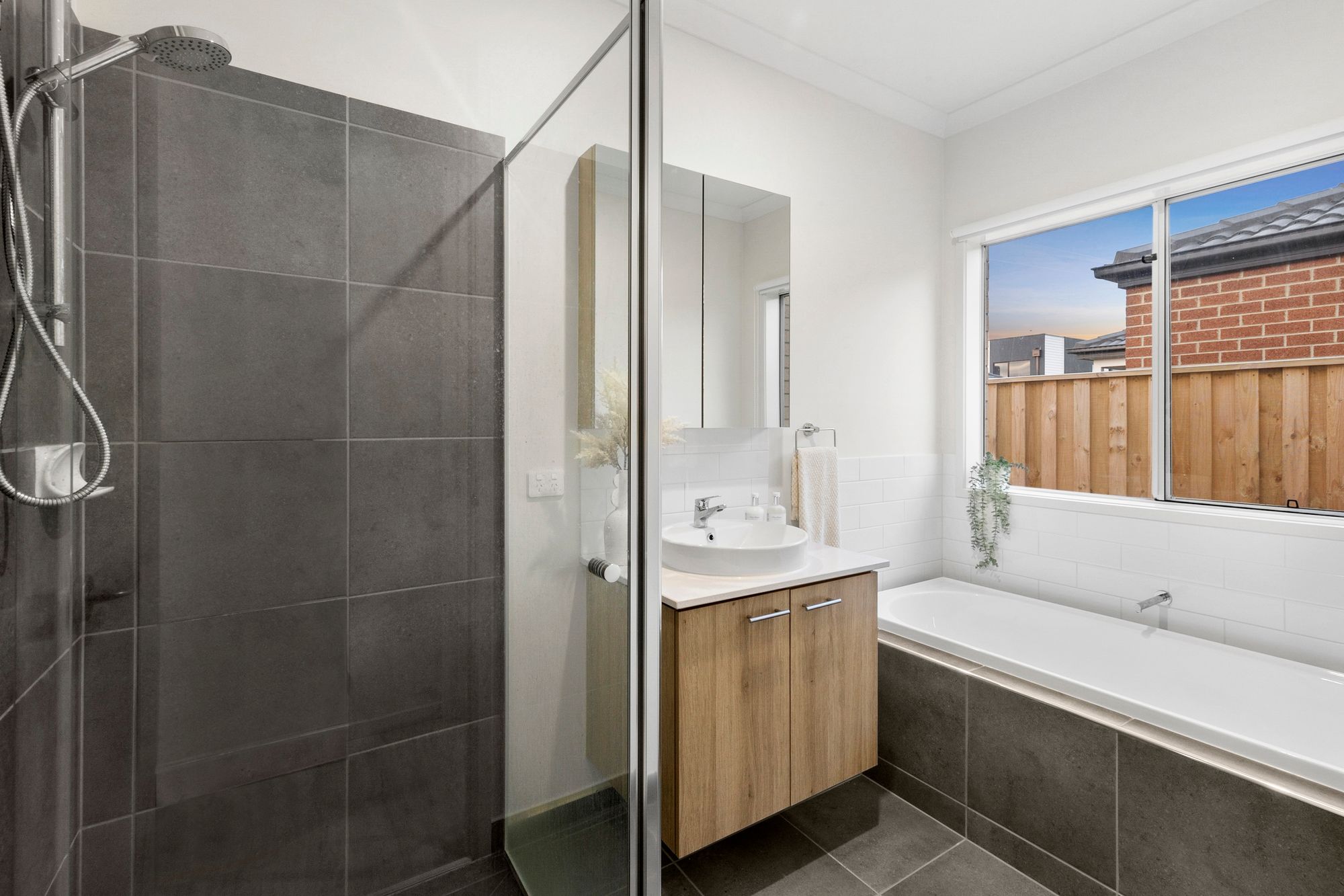Main bathroom: Semi frameless fully tiled shower, niche, upgraded fittings, bath, feature basin, 20mm stone benchtop, mirrored cabinetry, tile splash back, separate toilet, window with roller blinds