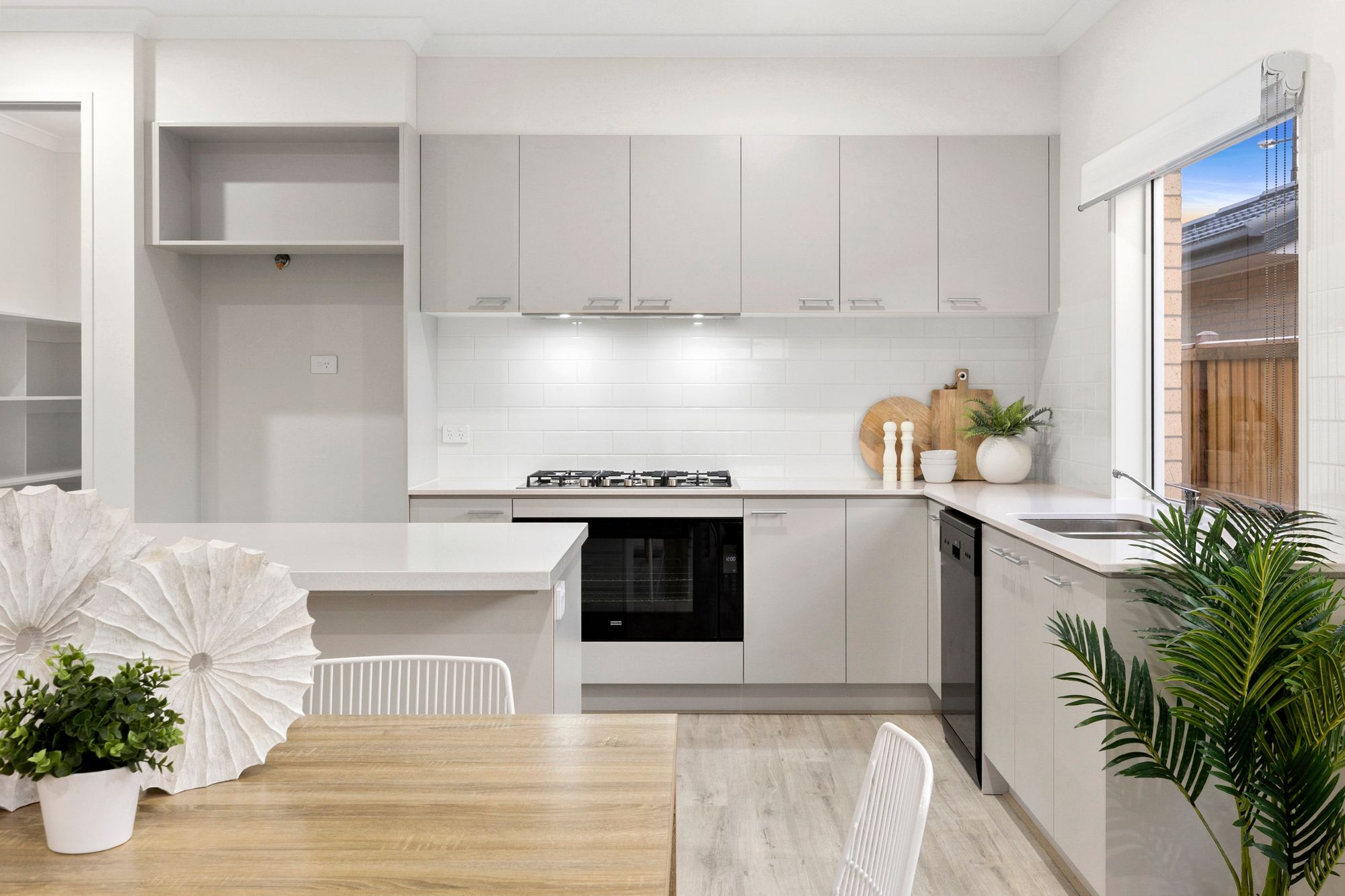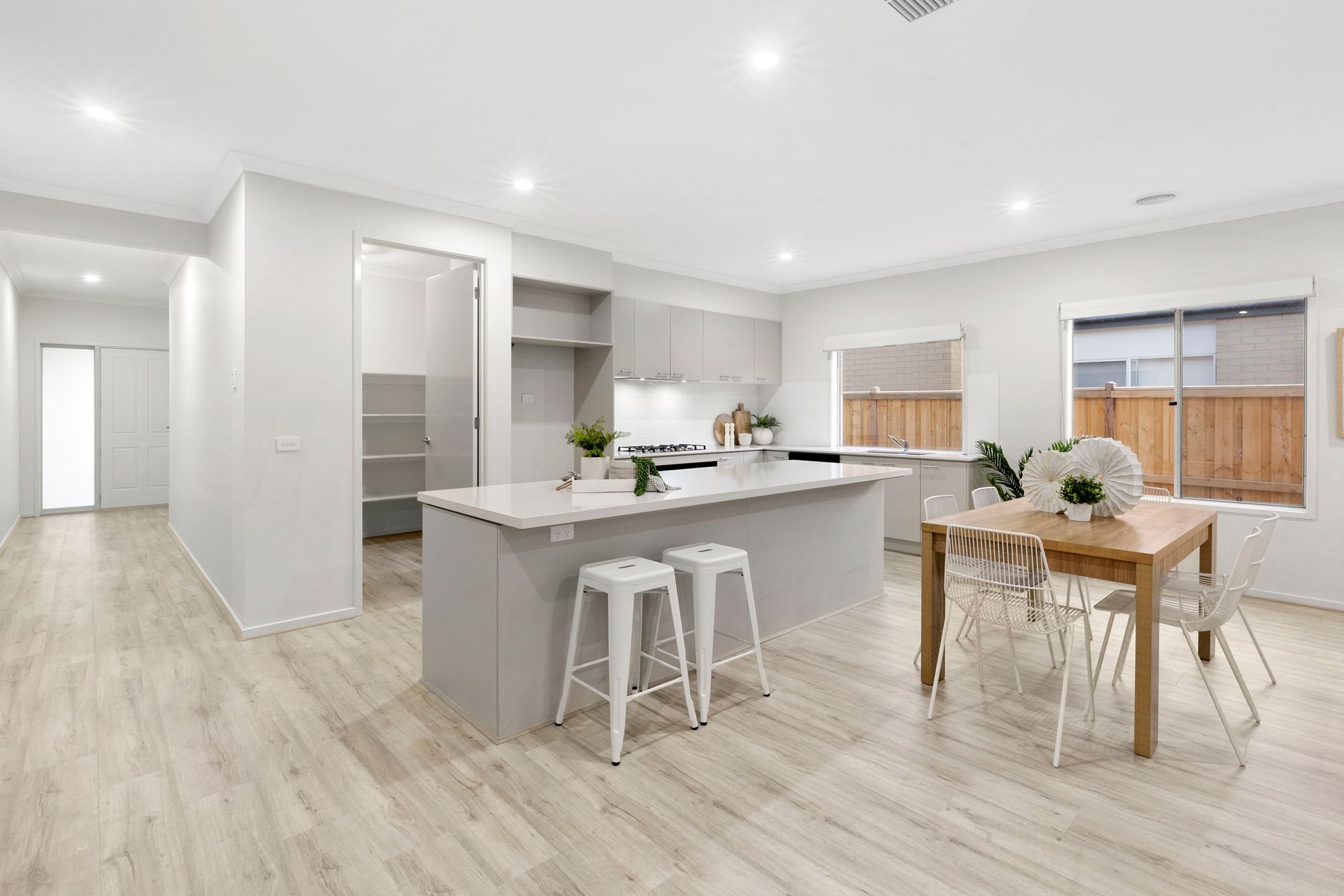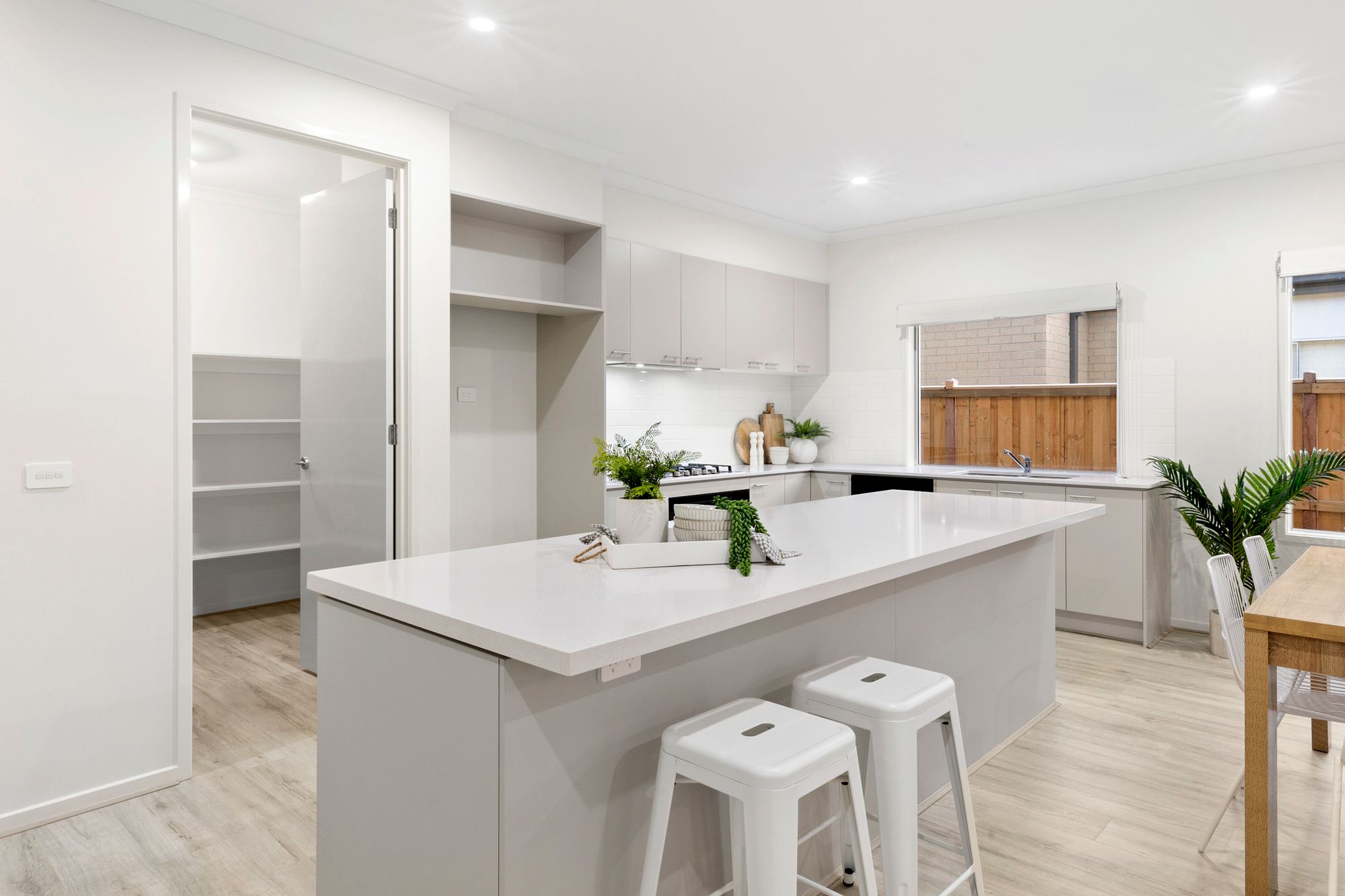 Kitchen: 40mm stone bench tops, island bench with breakfast bar overhang, double undermount sink, 900mm oven and range hood, built in microwave, dishwasher, feature tile splash back, overhead cabinetry, timber laminate flooring, downlights throughout, chrome fittings, spacious walk in pantry with shelving, additional window splashback with roller blinds, additional power points