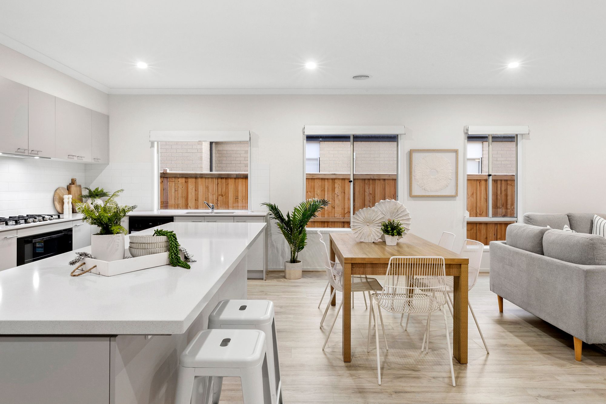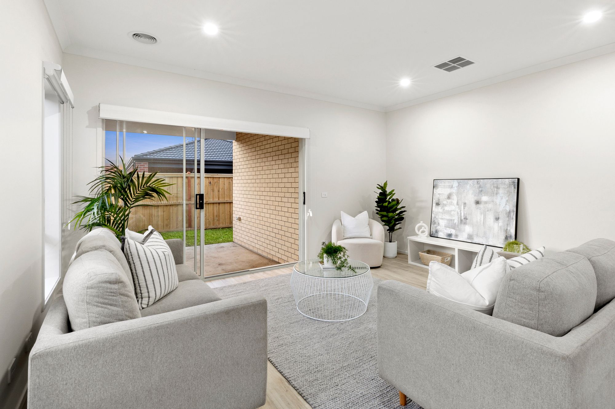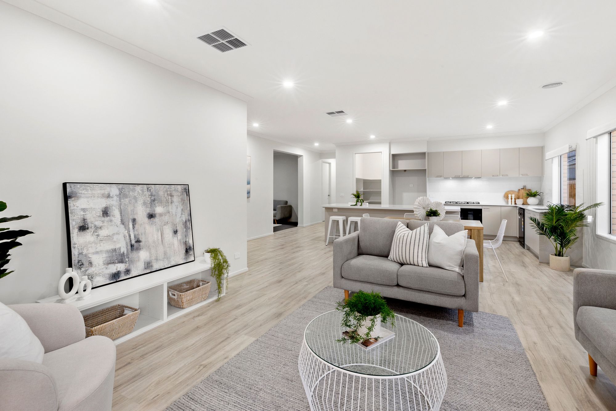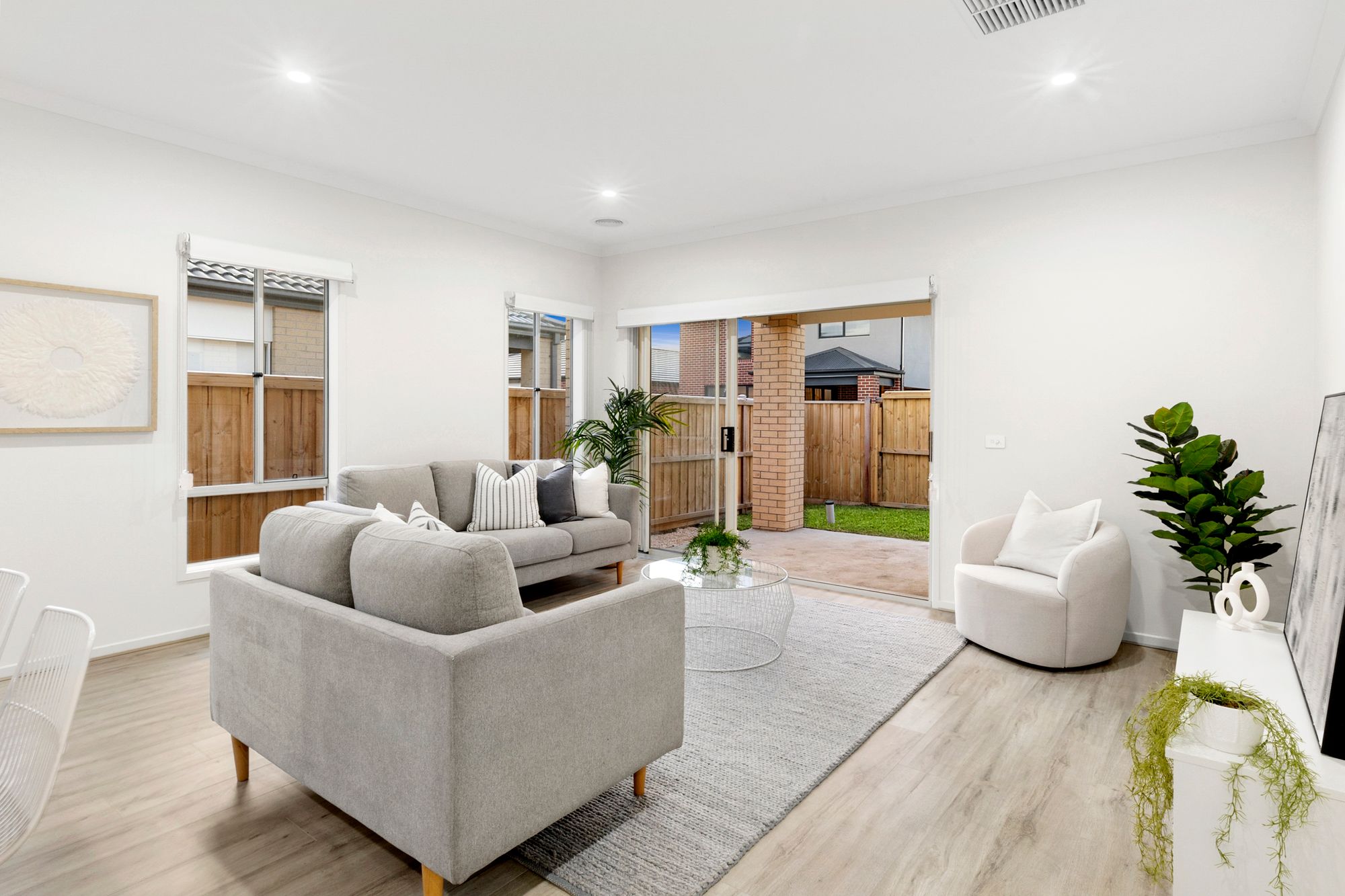 Living area: Open plan, timber laminate flooring, large windows, roller blinds, ducted heating, evaporative cooling, down lights, glass sliding doors to undercover alfresco, neutral colour scheme.