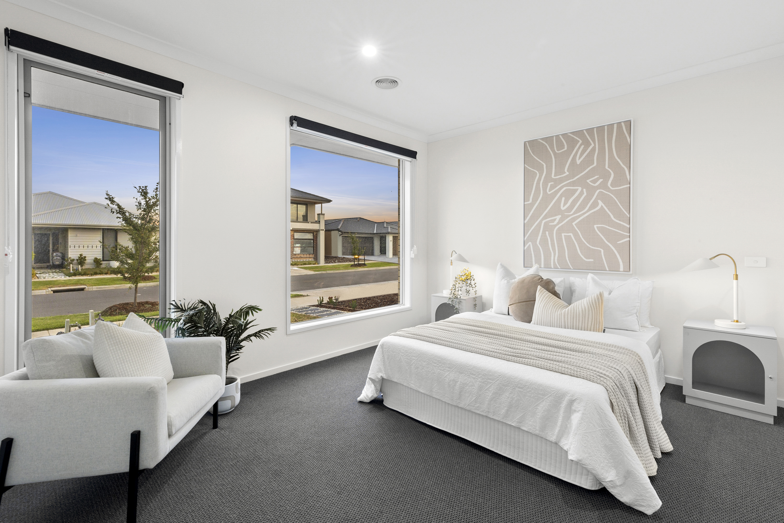 Master bedroom: Carpet, large windows with dual roller blinds, ducted heating, evaporative cooling, walk in robe, downlights, ensuite: extended fully tiled semi frameless shower, shower niche, upgraded fittings, double feature basin with extended vanity, stone benchtop, extended mirror, chrome fittings, toilet