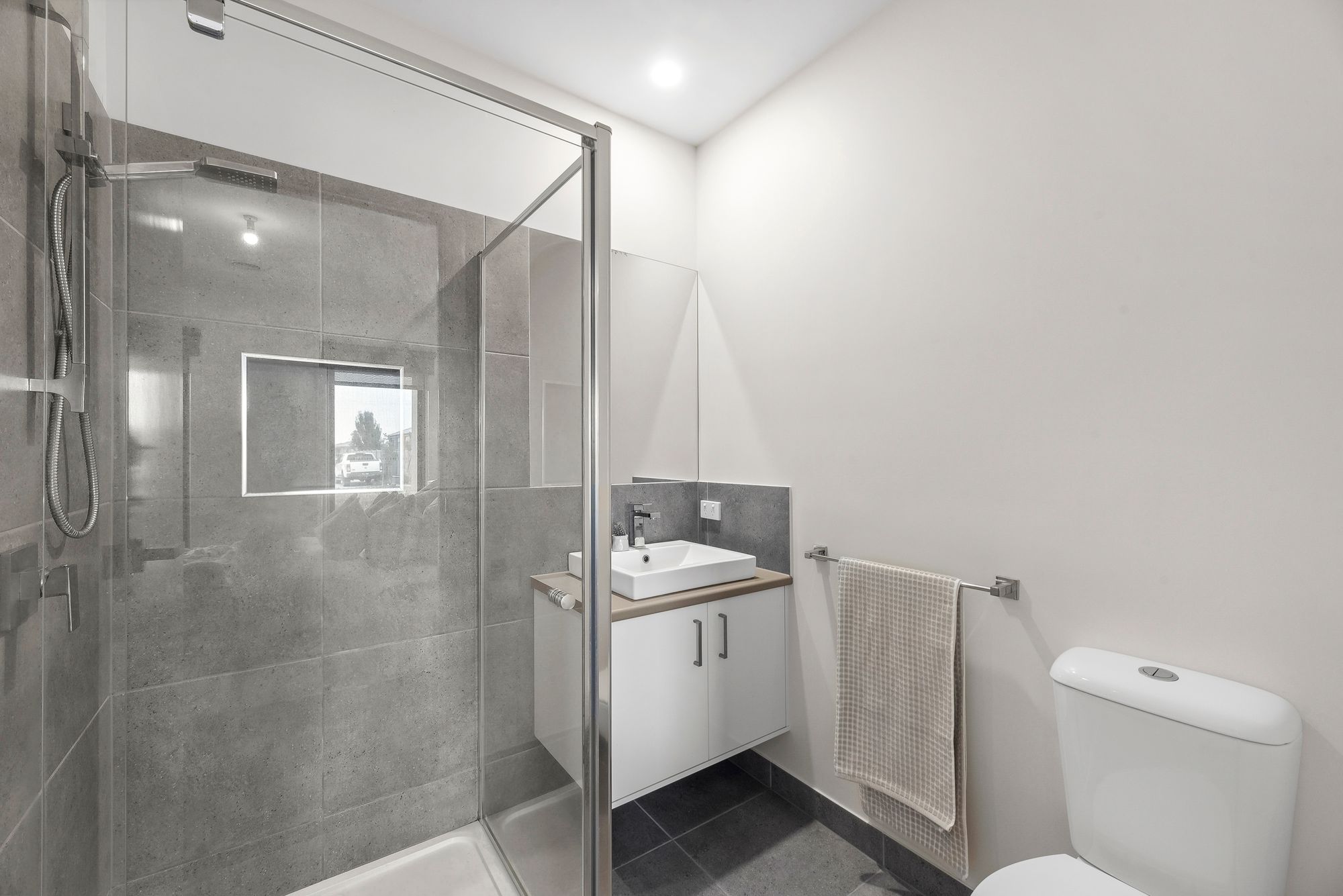 Ensuite – Large shower with wall mounted and hand-held showerhead, shower niche, single sink and vanity with ample storage, toilet, mirrored splashback and chrome fittings.