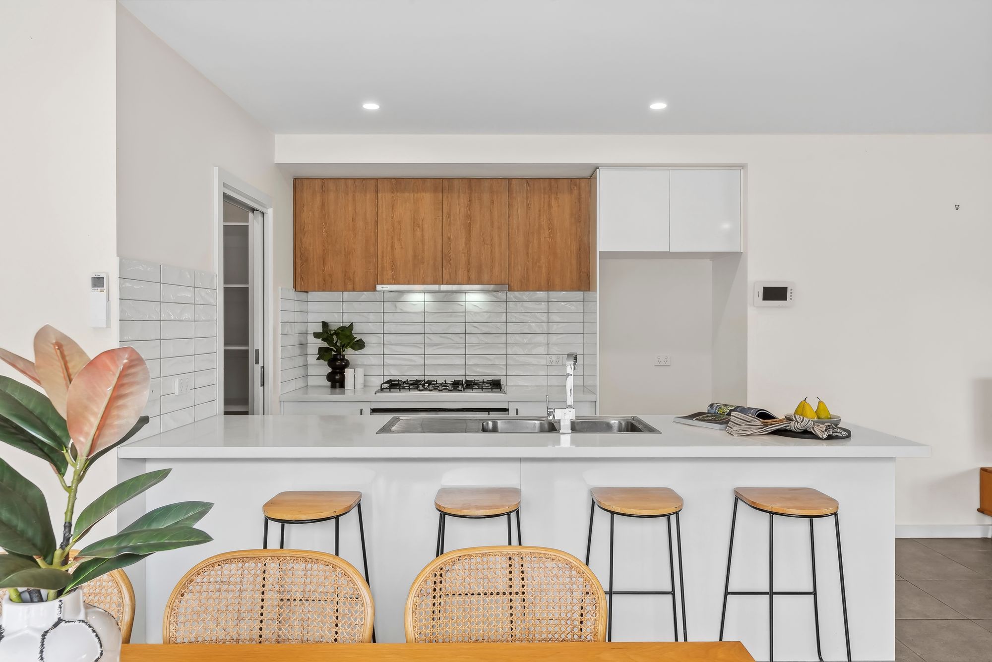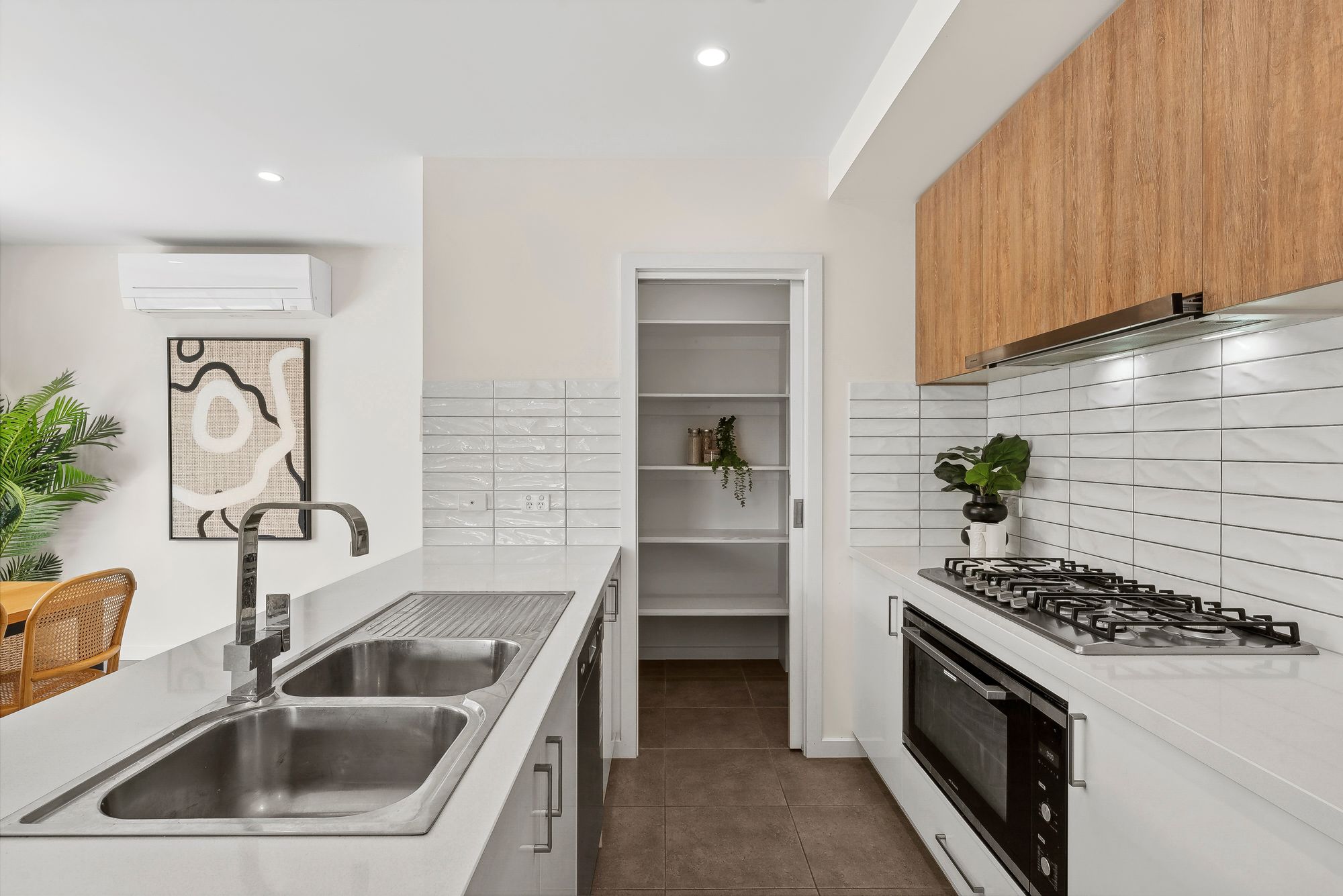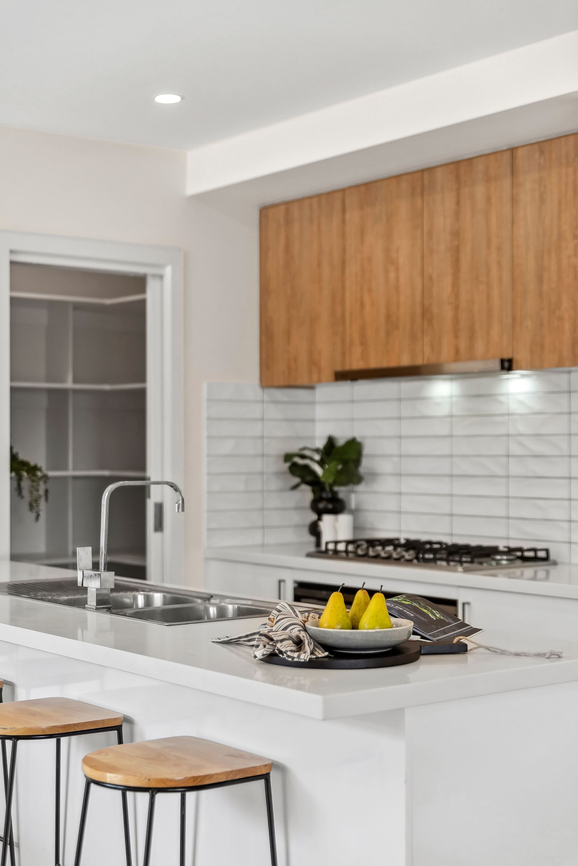 Kitchen – 40mm island stone benchtops with breakfast bar overhang, additional 40mm stone benchtops to rear benches, double basin sink, chrome fittings, downlights, power points throughout, stylish integrated oven and stainless steel stovetop, built-in rangehood, split-system heating/air conditioning and ducted heating, walk-in pantry, tiled splashback and flooring.