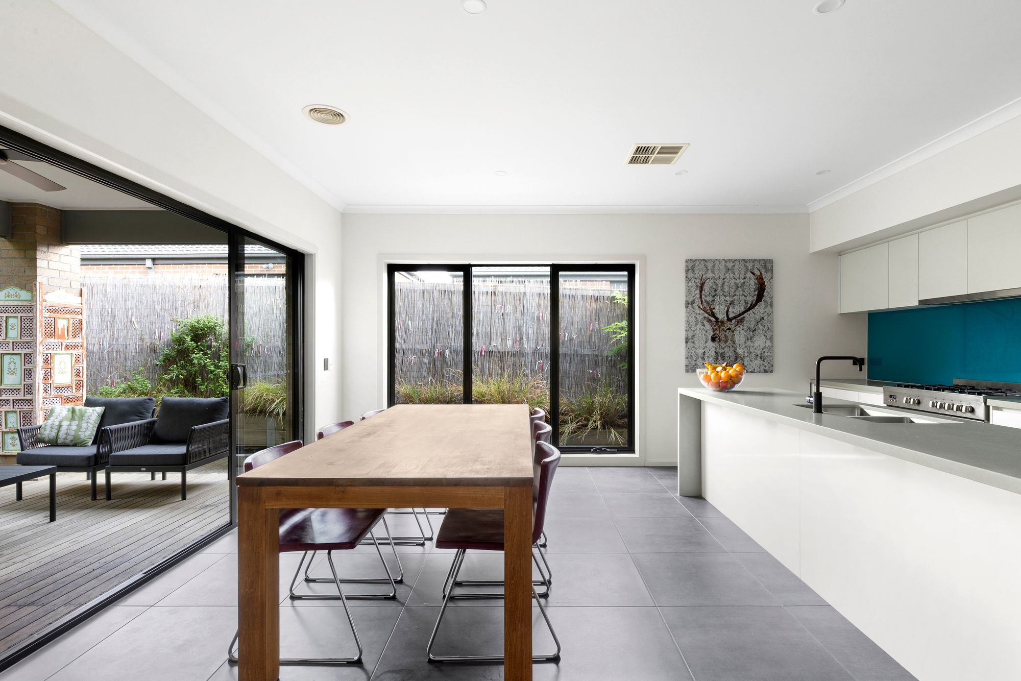 Open plan living and dining featuring an abundance of natural light, high ceilings, ducted heating, evaporating cooling, ceiling fan, tiled flooring, dual glass stacking doors, downlights, multiple powerpoint outlets, TV antenna point,