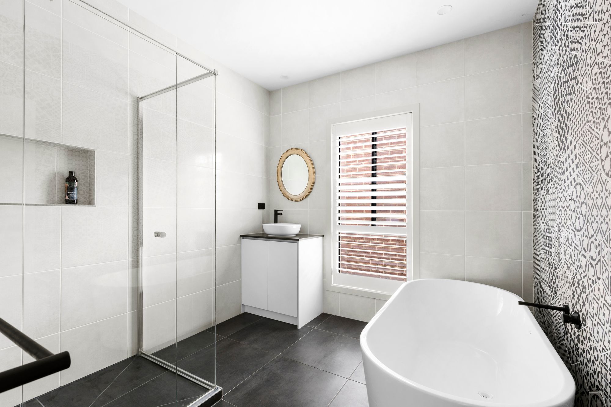 Floor to ceiling tiled, large semi-frameless shower containing hand-held shower head, 20mm stone benchtop, shower niche, freestanding bath, feature mirror, single vanity with ample storage, black fixtures and fittings, downlights, exhaust fan, dual towel holder, private toilet, plantation shutter, downlights
