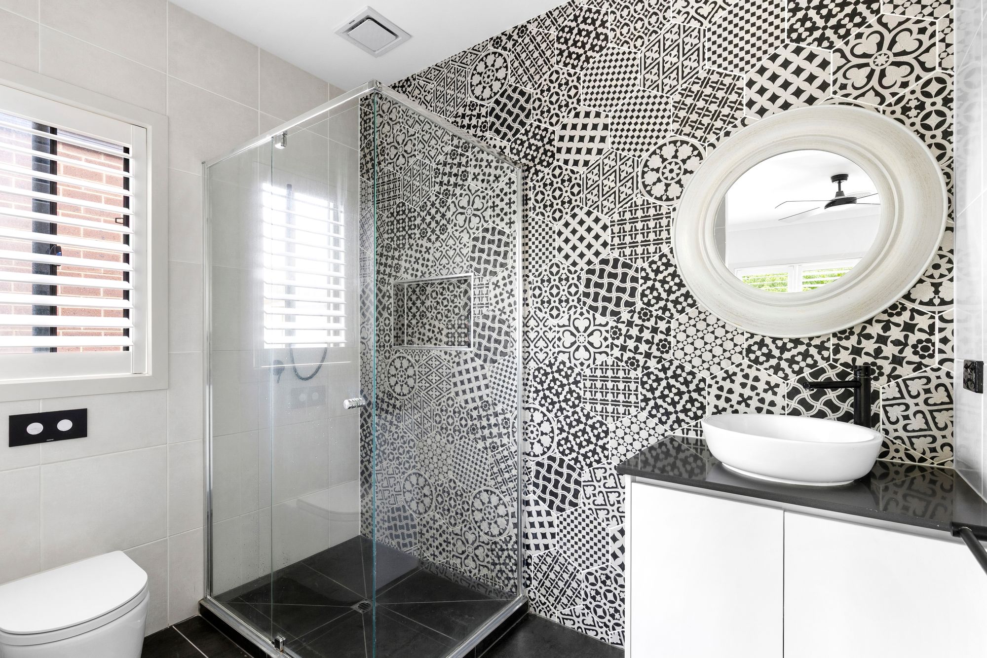 Floor to ceiling tiled, large semi-frameless shower containing hand-held shower head, 20mm stone benchtop, shower niche, feature mirror, single vanity with ample storage, black fixtures and fittings, downlights, exhaust fan, dual towel holder, upgraded toilet, plantation shutter, downlights,