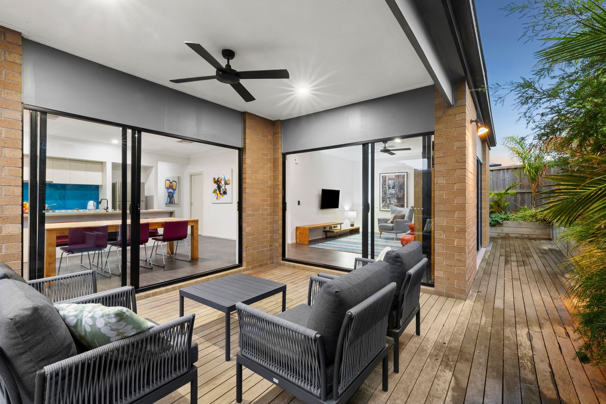 Extended undercover alfresco, ceiling fan, dual glass stacking door to alfresco area, downlights, private backyard with developed trees and established garden beds, feature deck surrounding the dwelling, secondary open entertaining area alongside the dwelling.