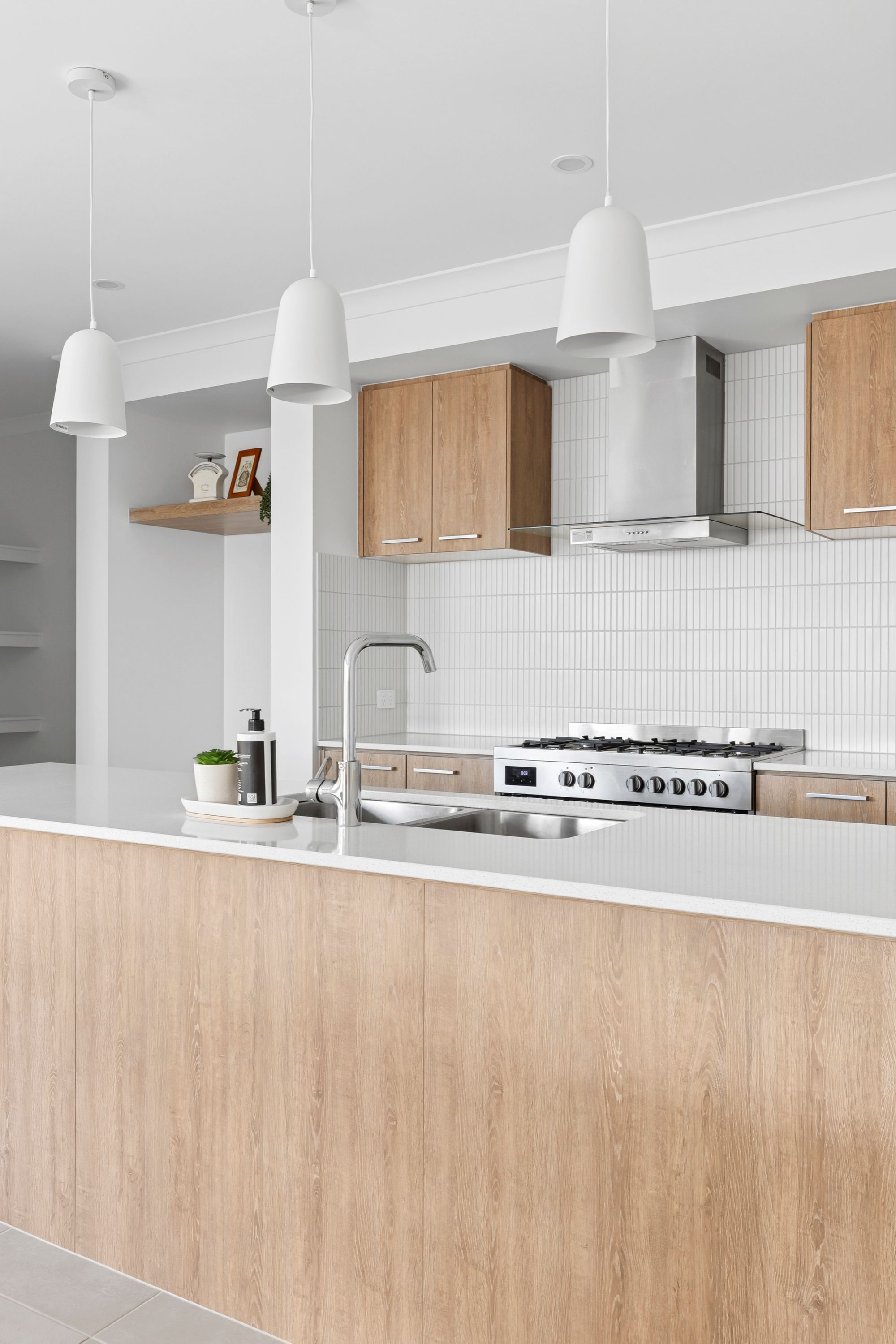 Kitchen: downlights, 900mm stainless steel gas cooktop, oven & glass finish rangehood, large walk in pantry with shelving, 20mm stone benchtops, double undermount sink, feature pendant lighting, overhead cabinetry, storage drawers, feature tile splash back, tile flooring, island bench with breakfast bar overhang, microwave provision & dishwasher.