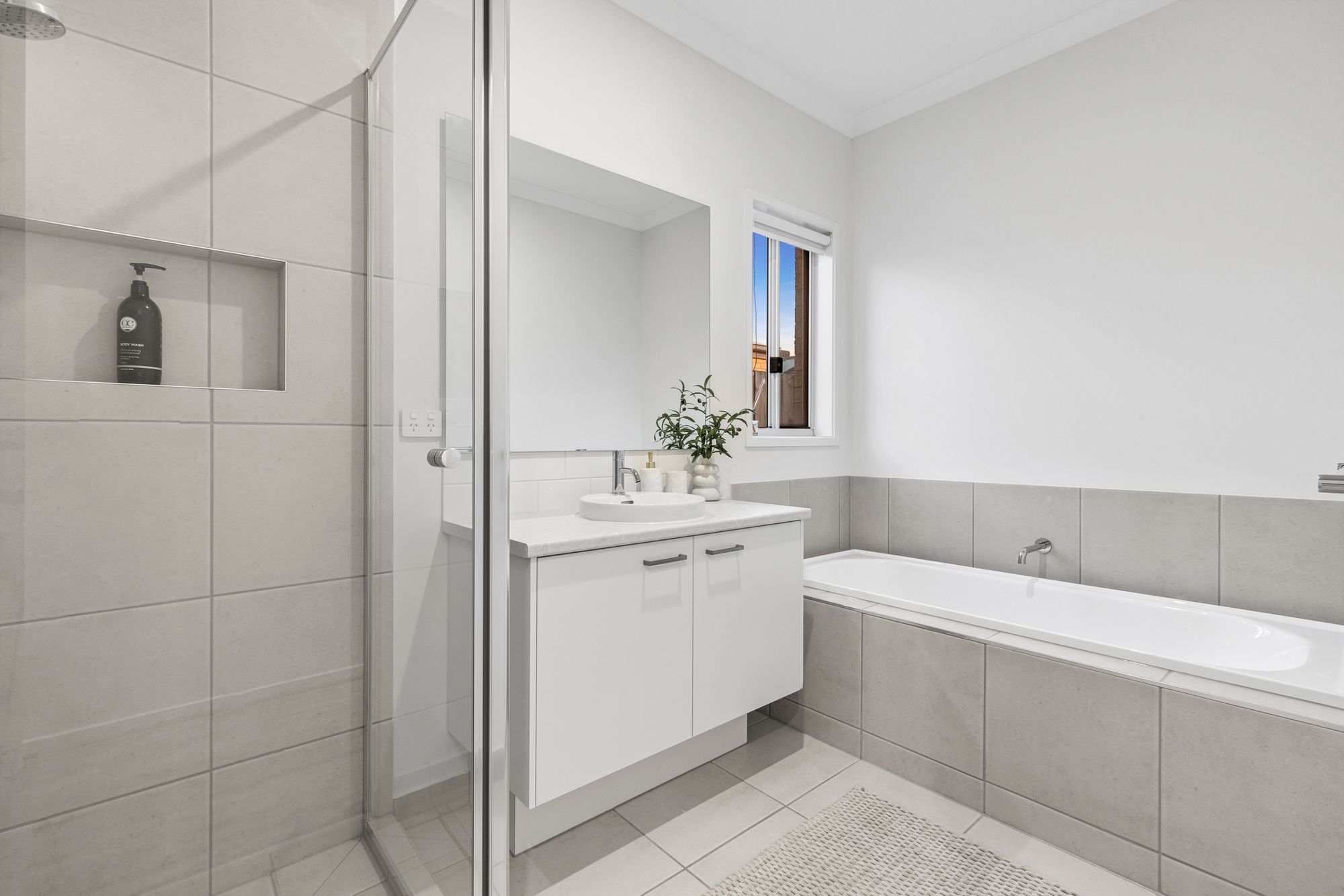 Main bathroom: Single vanity with ample storage, semi-frameless shower, shower niche, bath, window, roller blinds, tiles, towel rack, seperate toilet.