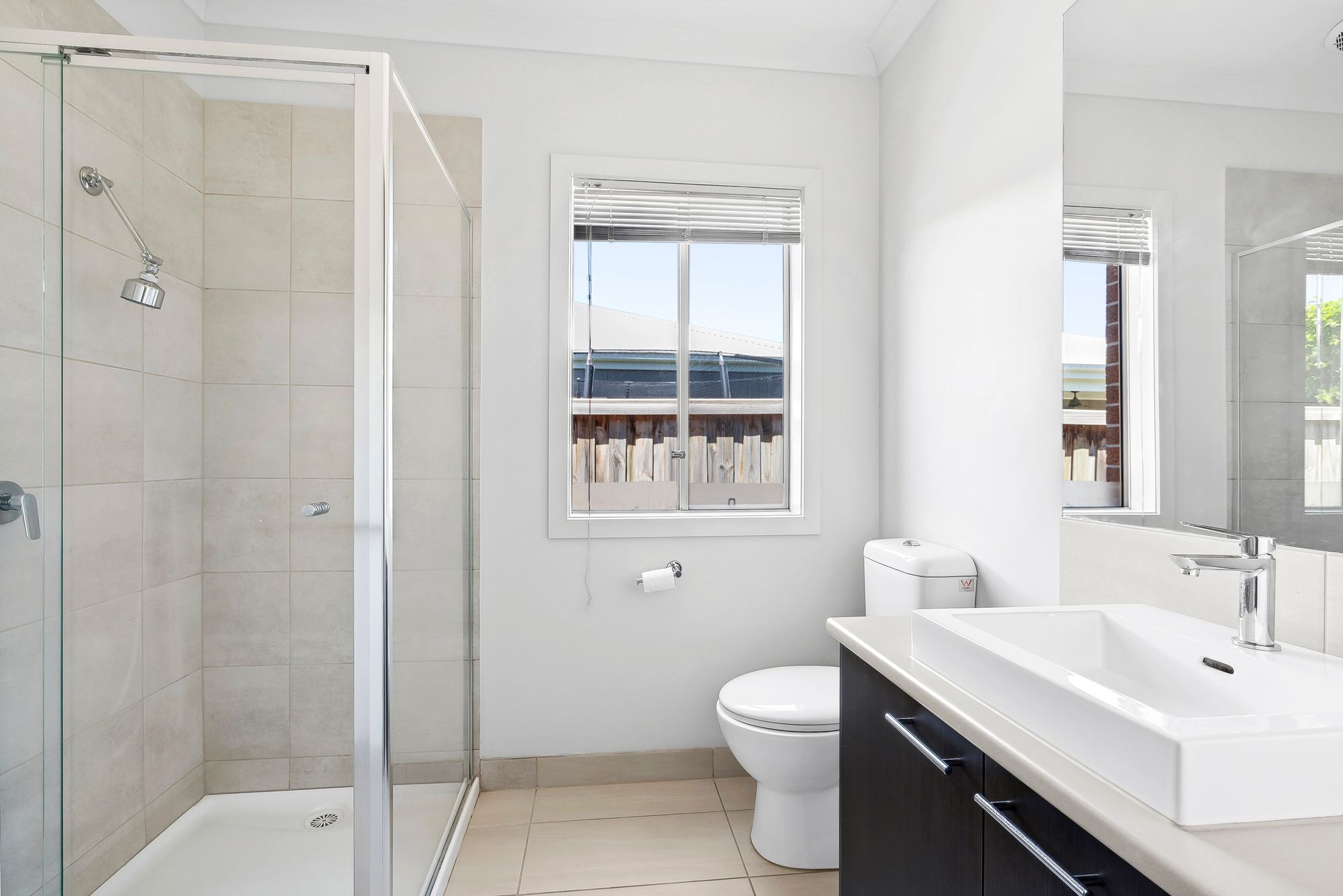 Ensuite: Tile flooring, single vanity with chrome fittings, mirror, single shower, toilet, window with roller blinds.
