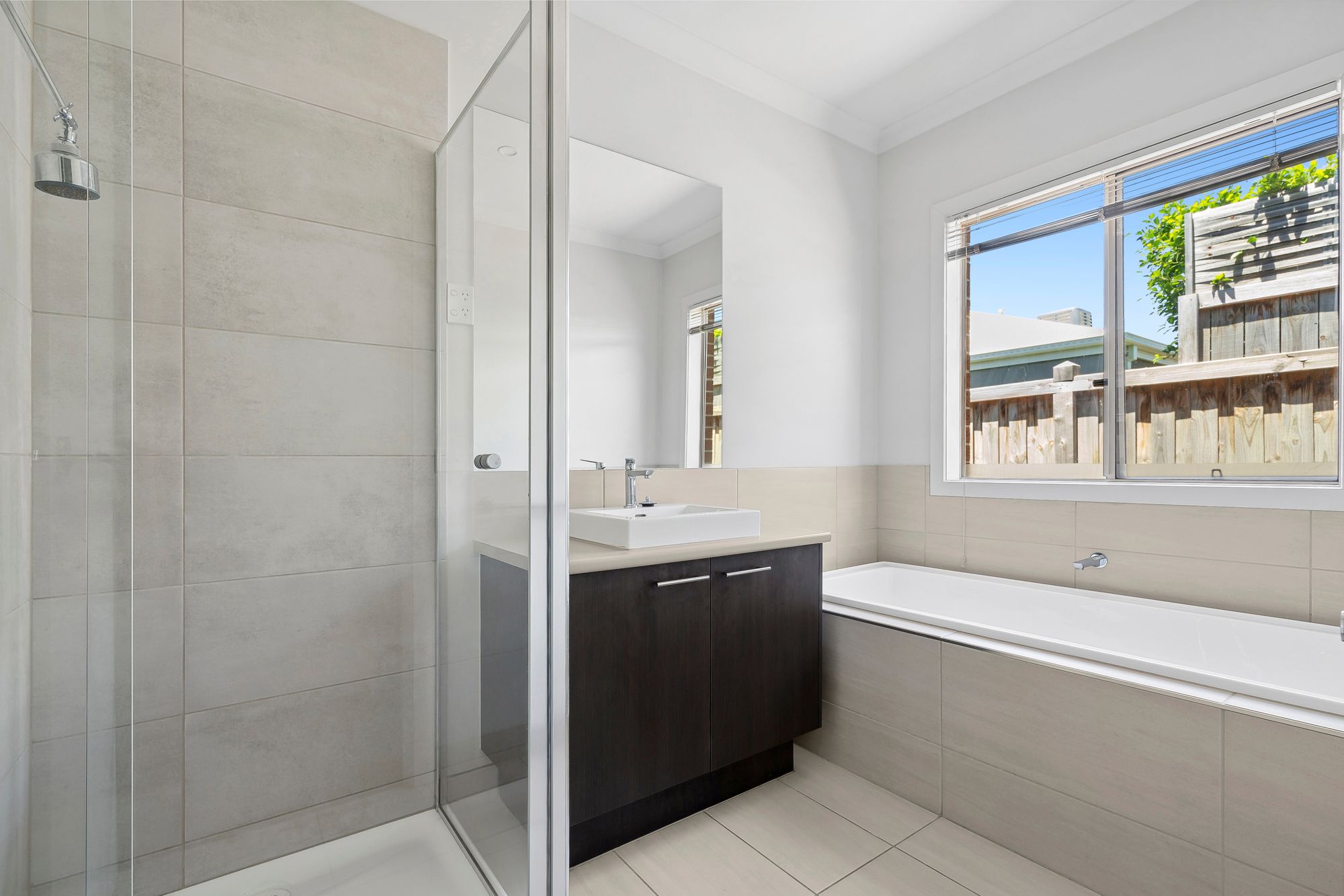 Main bathroom: Tile flooring, single shower with chrome fittings, single basin, mirror, bath, windows with roller blinds.
