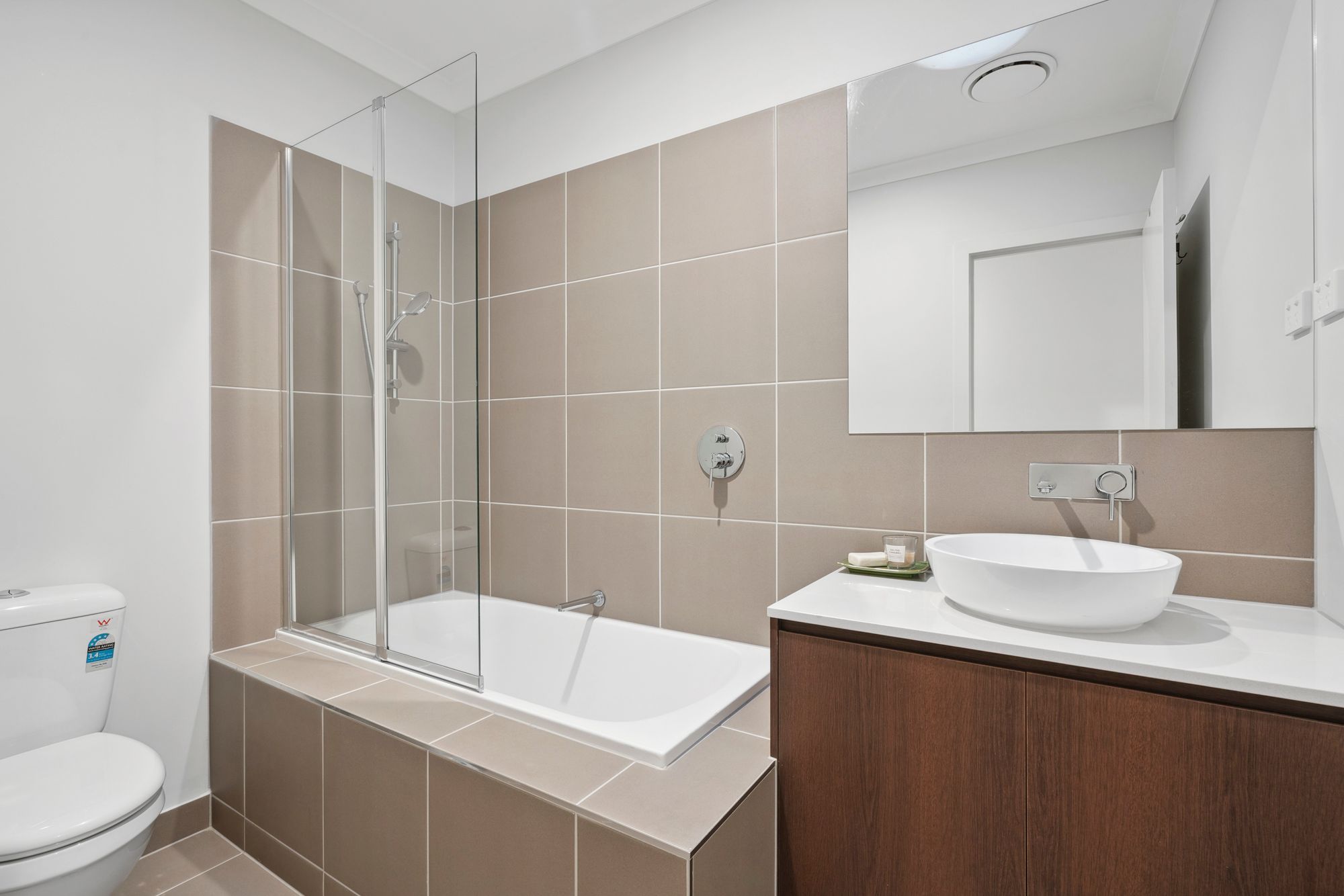 Main bathroom: Basin & storage vanity with mirror splashback and stone bench tops, chrome fittings, shower, bath, tiling & toilet.