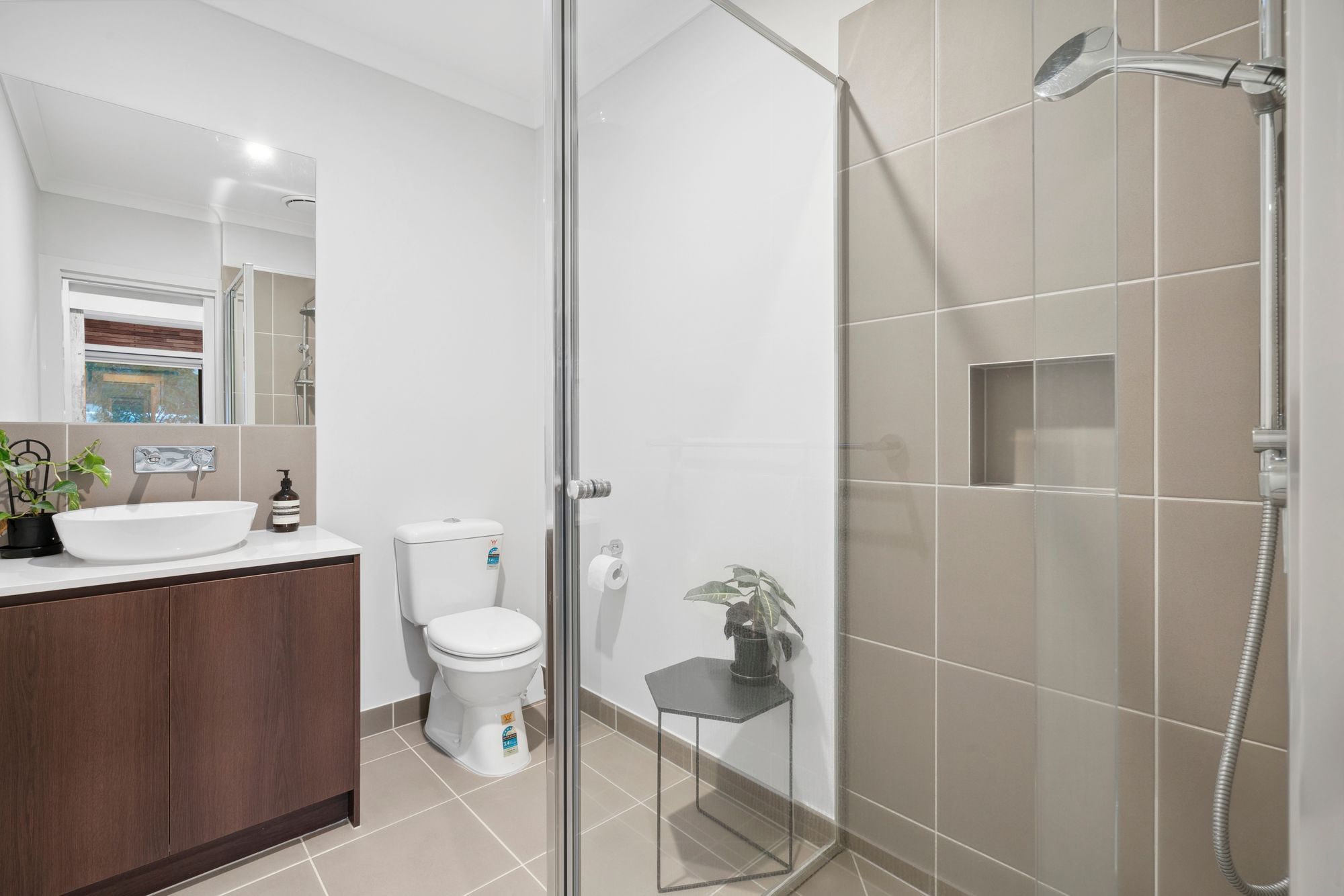 Master suite: Carpet flooring, ducted heating, roller blinds, barn door to walk in robe, ensuite comprising basin & storage vanity with chrome fittings and stone bench top, mirror splashback, semi-frameless shower with rain shower and hand held shower set complete with tiling & shower niche, open toilet.